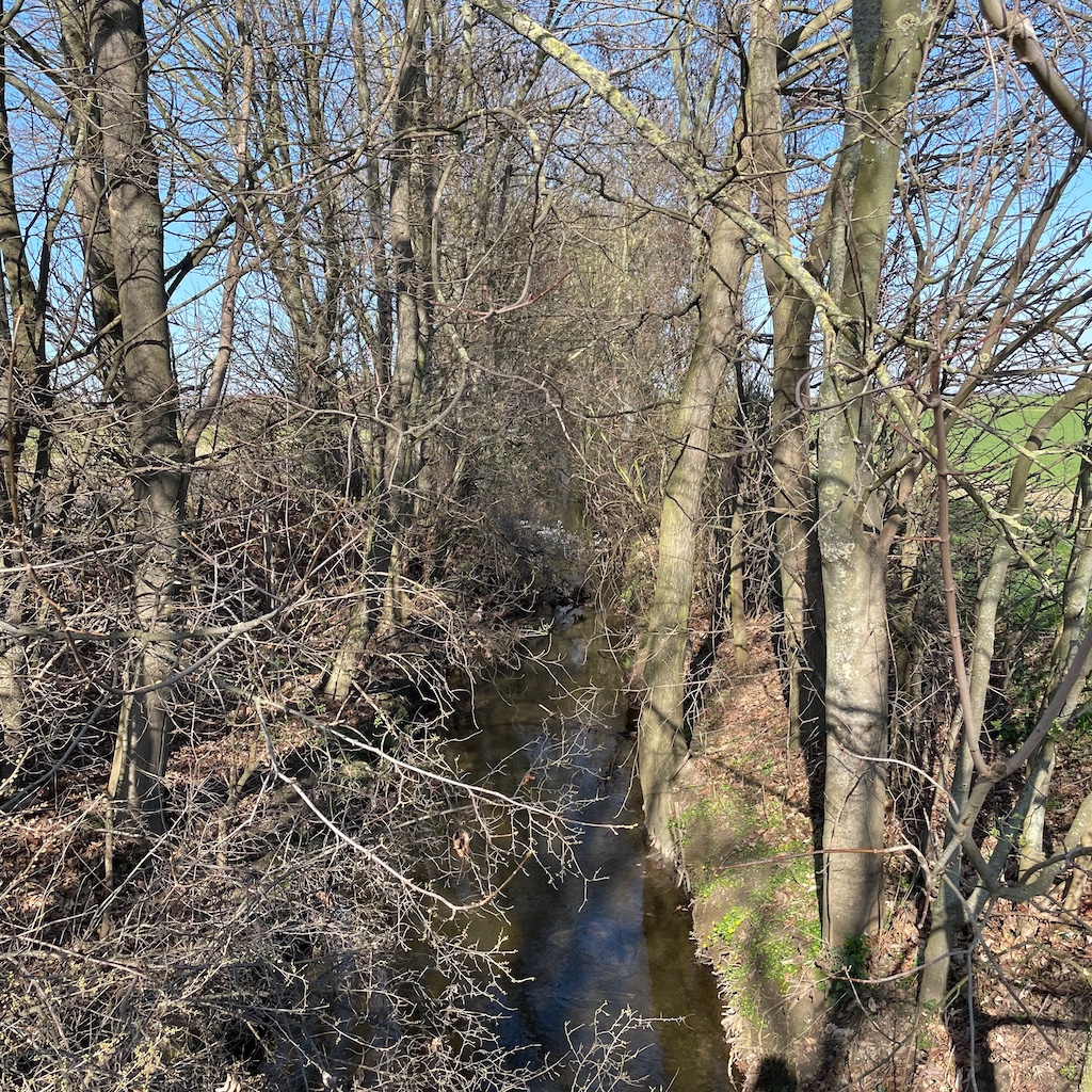 Kurz vor dem Eichenkamp wich ich von der vorgegeben Route ab, weil die Karte eine schönere Strecke entlang des Bornheimer Baches in Aussicht stellte. Dazu überquerte ich die stark befahrene Landstraße 192 an einer nicht für Überquerungen vorgesehenen Stelle, es ging gut und hat sich gelohnt. Am Bach sah ich erstmals einen Eisvogel, jedenfalls glaube ich, dass es einer war, so ein blauglänzender. Im übrigen sah ich heute den ersten Schmetterling des Jahres, ob Tagpfauenauge oder Kleiner Fuchs war im Flattern nicht klar zu erkennen, und die erste Hummel.