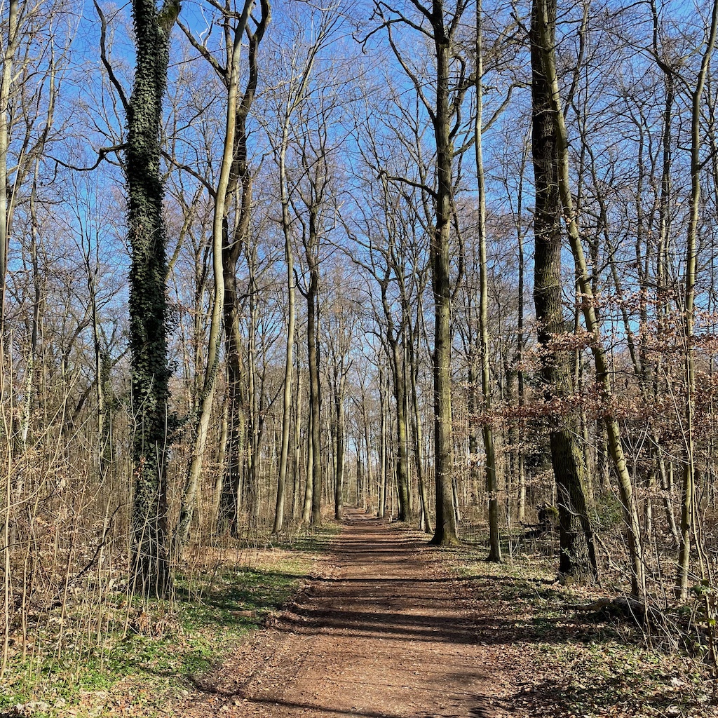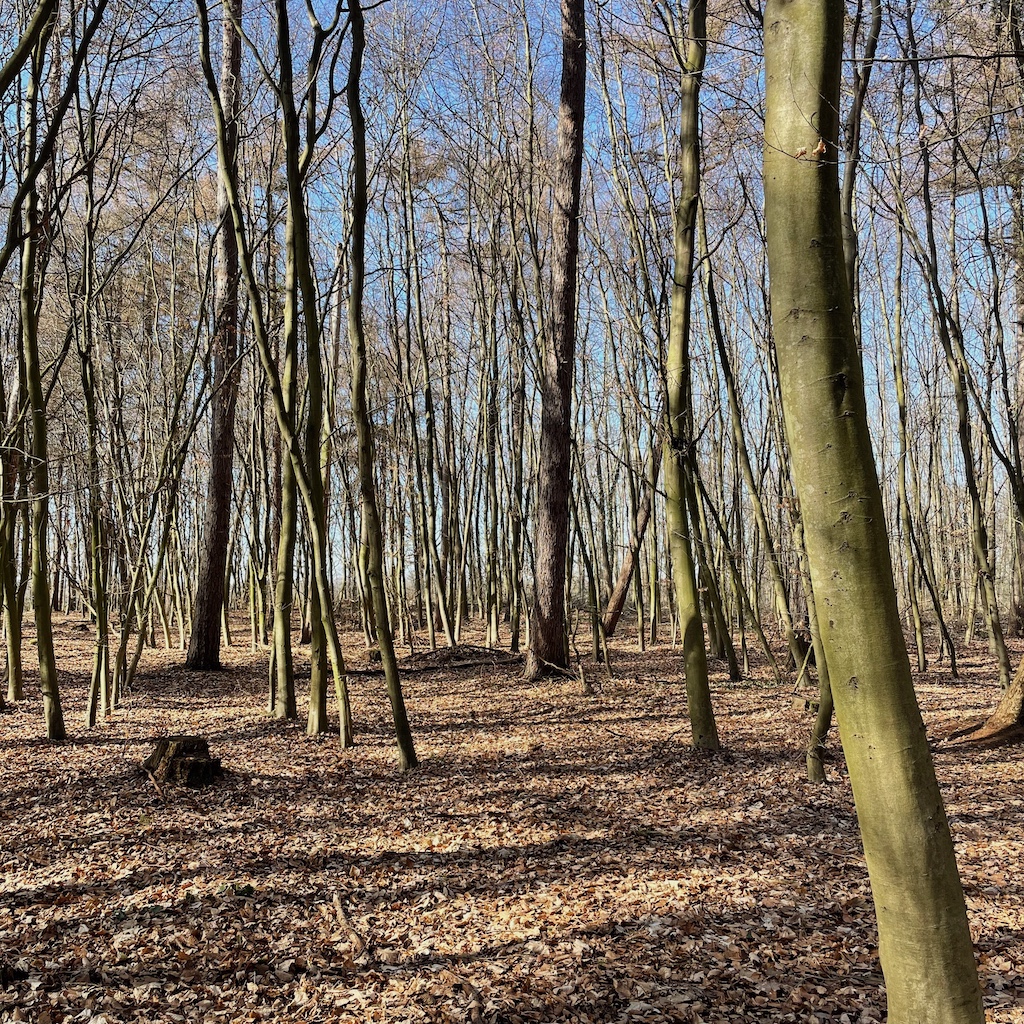 Den Eichenkamp-Wald müssen erst kürzlich schwere Maschinen der Forstwirtschaft heimgesucht haben, einige Wege waren aufgewühlt, zum Glück wegen der Trockenheit der vergangenen Tage nicht mehr matschig. Ansonsten ist das Wäldchen erfüllt vom Dauerrauschen der Autobahn 555 in unmittelbarer Nähe.