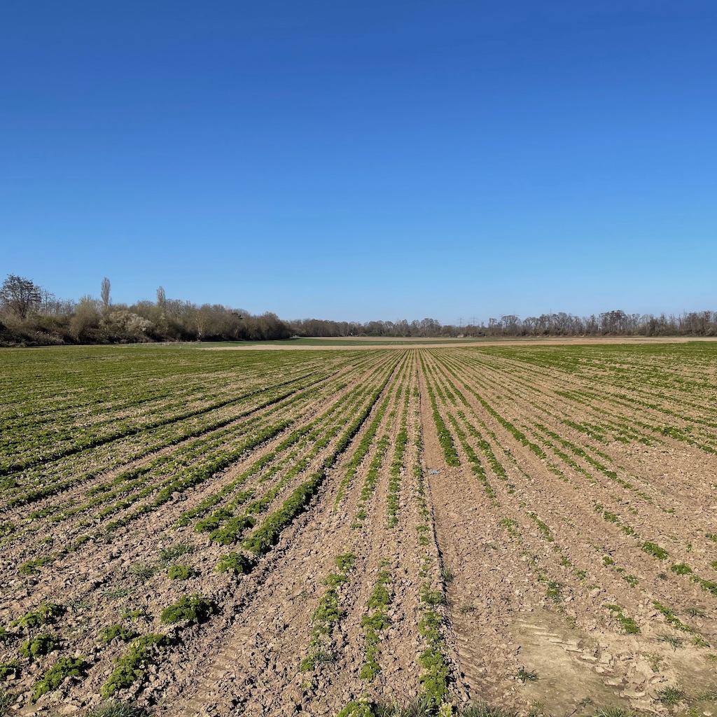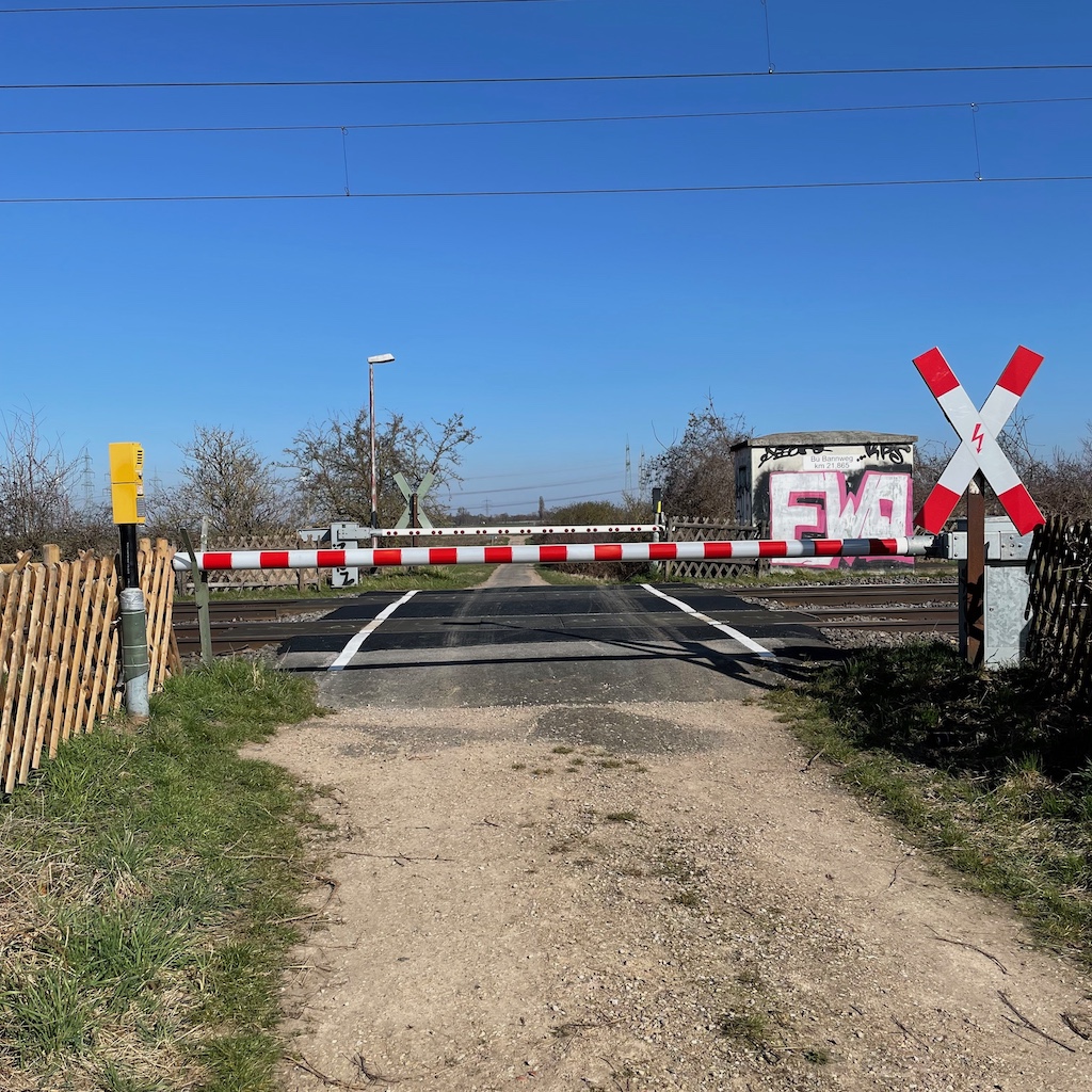 Die erste Hälfte führt überwiegend durch rheinische Dörfer, es gibt es auch Abschnitte durch Wald und Feld. Das Wetter war bestens, schon nach einer halben Stunde wurde es so warm, dass die Daunenjacke im Rucksack verstaut wurde. Die Landschaft auf der zweiten Hälfte zwischen Vorgebirge und Rhein ist zunächst eintönig: Nachdem man ein tristes Gewerbegebiet mit viel Schotterfläche unterhalb von Kardorf hinter sich gelassen und die Vorgebirgsbahn (Stadtbahnlinie 18) überquert hat, flaniert man auf asphaltierten Wegen durch weite, ebene Felder ohne Baum und Strauch, dafür mit Hochspannungsmasten, ehe es ab der Rheinmittelterrassenkante (ein schönes Wort mit hohem Scrabblepunktepotential) wieder abwechslungsreicher wird. Zur Querung der Bahnstrecke Köln – Bonn muss man eine Anrufschranke passieren. Die ist grundsätzlich geschlossen, nur auf Anforderung per Knopfdruck an einer Gegensprechanlage wird sie geöffnet, falls nicht gerade ein Zug kommt. Wenn doch, sagt die freundliche Dame „Moment, eine Zugfahrt“, so wie bei mir heute, und öffnet anschließend. Ob am anderen Ende eine echte Eisenbahnerin sprach oder ein Bot (bzw. eine – wie heißt das – Botin?), war nicht klar zu erkennen. Egal, Hauptsache, man kommt über die Gleise und nicht unter die Räder.