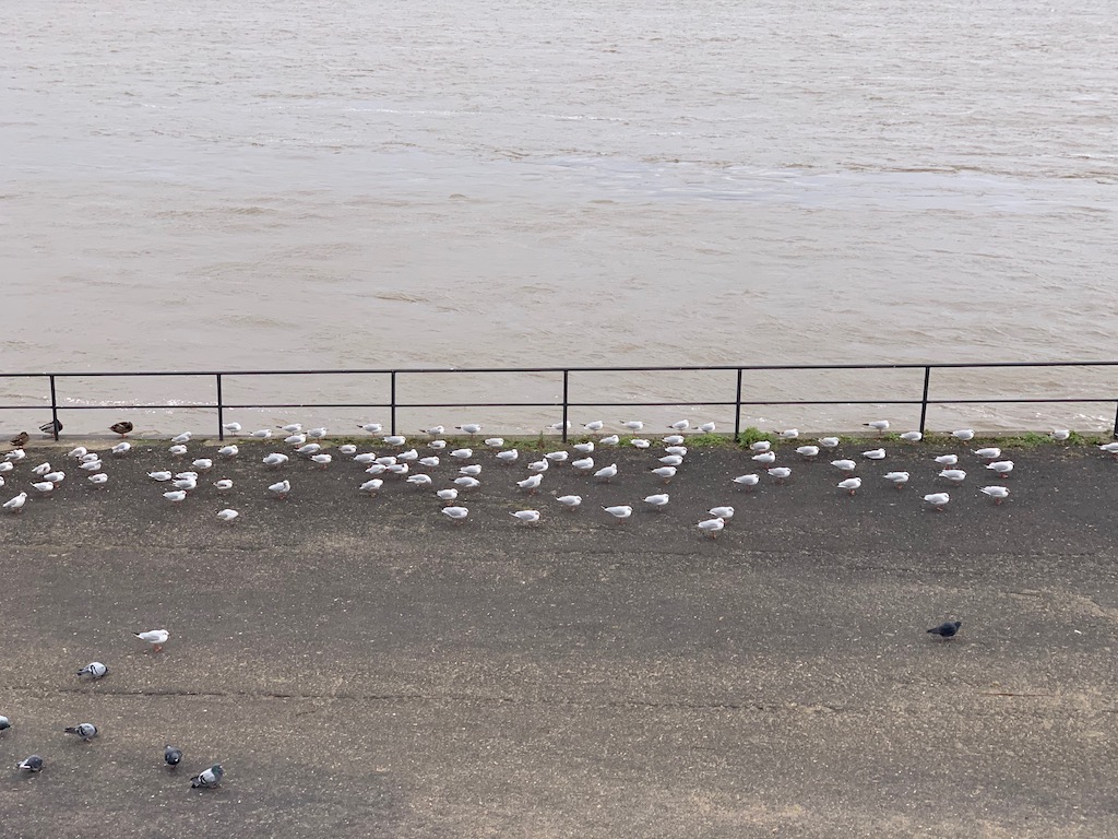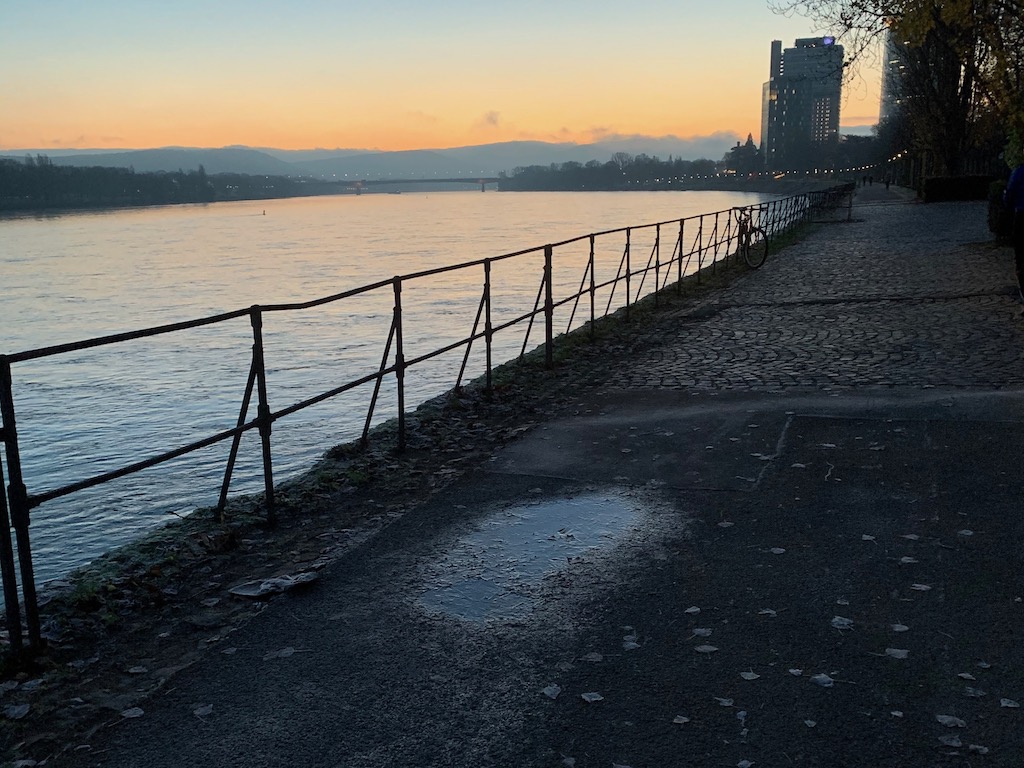 Sonntag: Die Weihnachtswoche endete appetitlos, trübe, kalt und regnerisch. Das hielt mich nicht vom Sonntagsspaziergang ab, wenn auch nur kurz runter an den Rhein und durch die Nordstadt zurück. Ein Sonntag ohne Spaziergang ist für mich mittlerweile so unvollständig wie für andere Weihnachten ohne Amazon. Am Rhein saßen die Möwen zusammen mit ein paar Enten und Tauben, allesamt vom Wind sorgsam in Richtung Süden ausgerichtet, als schauten sie dem Gebläse entgegen und dächten: Menno (oder was Vögel so denken, wenn sie mit der Situation unzufrieden sind), wann hört das endlich auf?