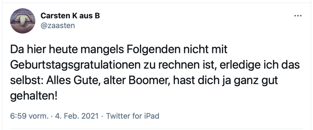 Wegen des akuten Frühlingseinbruchs verband ich den Gang zum Altglascontainer mit einem Spaziergang. Am Straßenrand parkte ein Golf II, so einer wie ich ihn früher fuhr, mit H-Kennzeichen. Abgesehen von der Fragwürdigkeit, Halter so alter Karren Steuererleichterungen zu gewähren: Was sagt das über mein Alter aus? Bekomme ich demnächst auch so ein H verpasst, und wenn ja, wohin?