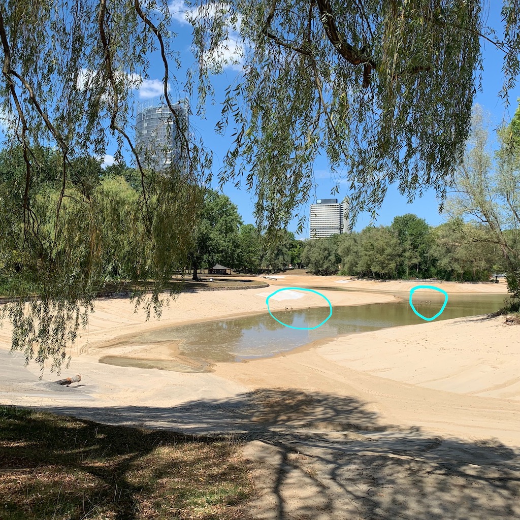 Ein Krankenwagen hielt an, ein Sanitäter stieg aus mit einem Käfig in der Hand, darin, soweit aus der Ferne erkennbar, eine Ente. Damit ging er runter zum Fluss und kehrte bald, nachdem er die Ente zu Wasser gelassen hatte, mit leerem Käfig zurück zum Rettungswagen und sie fuhren wieder ab, neuen Einsätzen entgegen.