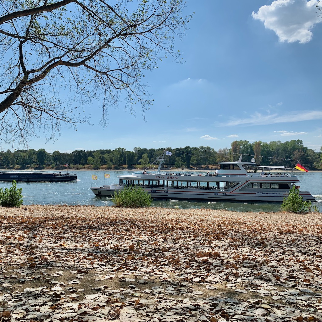 Die Schiffe fahren rheinaufwärts ganz nah am Ufer, abwärts etwas weiter zur Flussmitte. Vielleicht schreibt das die Rheinschiffahrtsverkehrsordnung oder welche Regelung hier auch immer einschlägig ist für diese Stelle so vor, ich weiß es nicht. Wobei, manche fahren auch andersrum, also abwärts am Ufer und aufwärts mittig. Immerhin, noch fahren welche. Die Fahrgastschiffe sind nur schwach besetzt, niemand winkt. Es ist zu warm für jede überflüssige Aktivität. Ein Schwarm Düsenbarken* (auch als Jetski bekannt) zog lärmend Richtung Königswinter. Auch so eine fragwürdige Freizeitgestaltung.