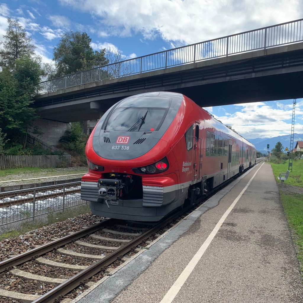 BeiAnkunft am Zielbahnhof lächelte ich noch mehrDie Dieseltriebzüge der Baureihe 633 weisen nicht nur eine übelgelaunte Physiognomie auf, sie sind auch recht unkomfortabel und dröhnen innen sehr laut. Für längere Reisen nicht zu empfehlen.Im Hintergrund der Niedersonthofener See