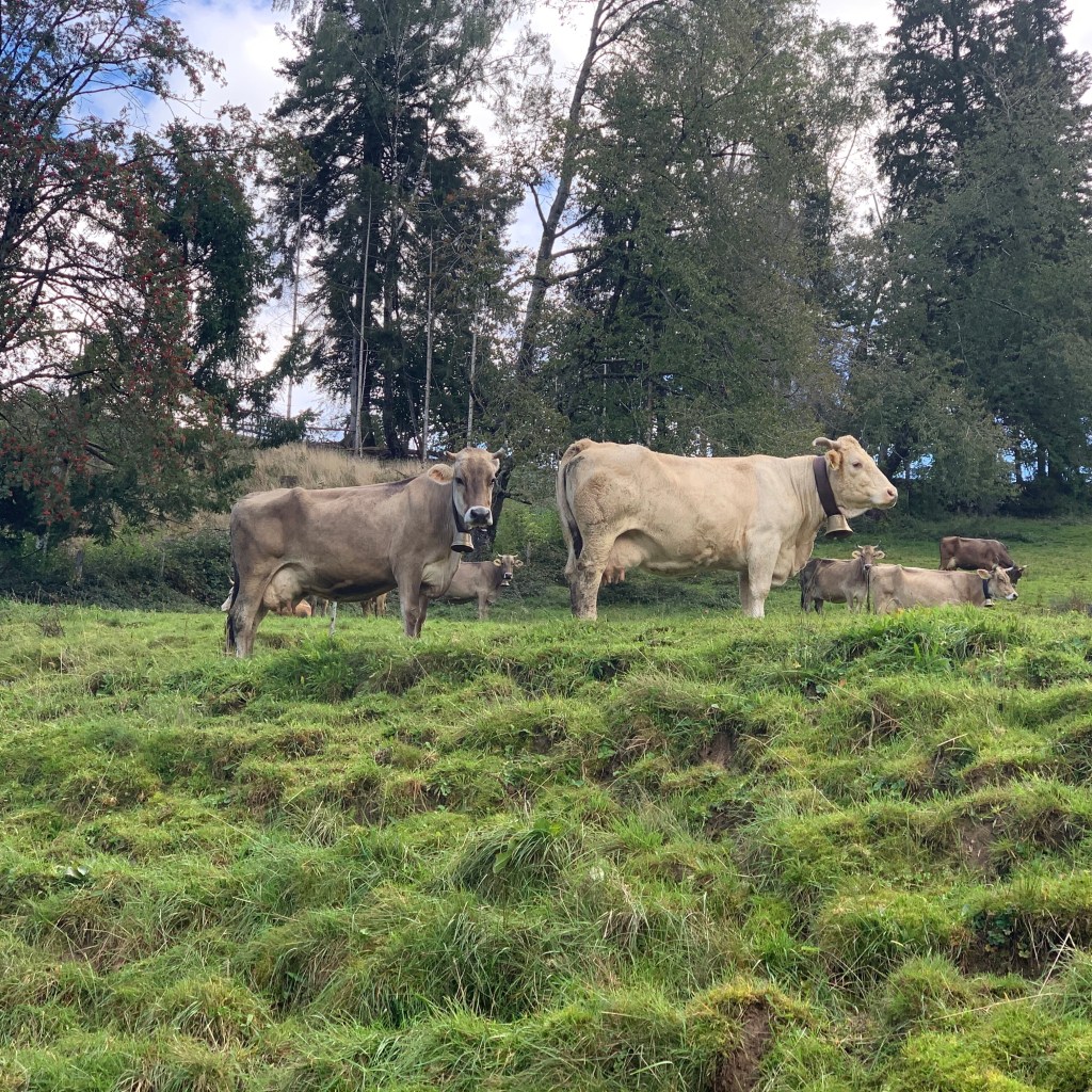 Auf dem Weg nach OberdorfMont Grünten in Wolken, rechts hinten die Oberst(!)dorfer AlpenLetztere aus anderer Perspektive Zwischen Oberdorf und EckartzEbenso, nun sonnenbeschienenGopprechtsEs muss schlimm sein, den Tag mit so einer Glocke am Hals zu verbringen. Immerhin wurden ihnen nicht, wie den meisten Artgenossinnen, in jungen Jahren die Hörner weggeätzt. Insgesamt wirkten sie relativ glücklich.