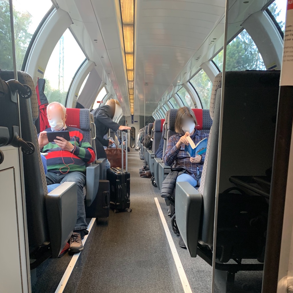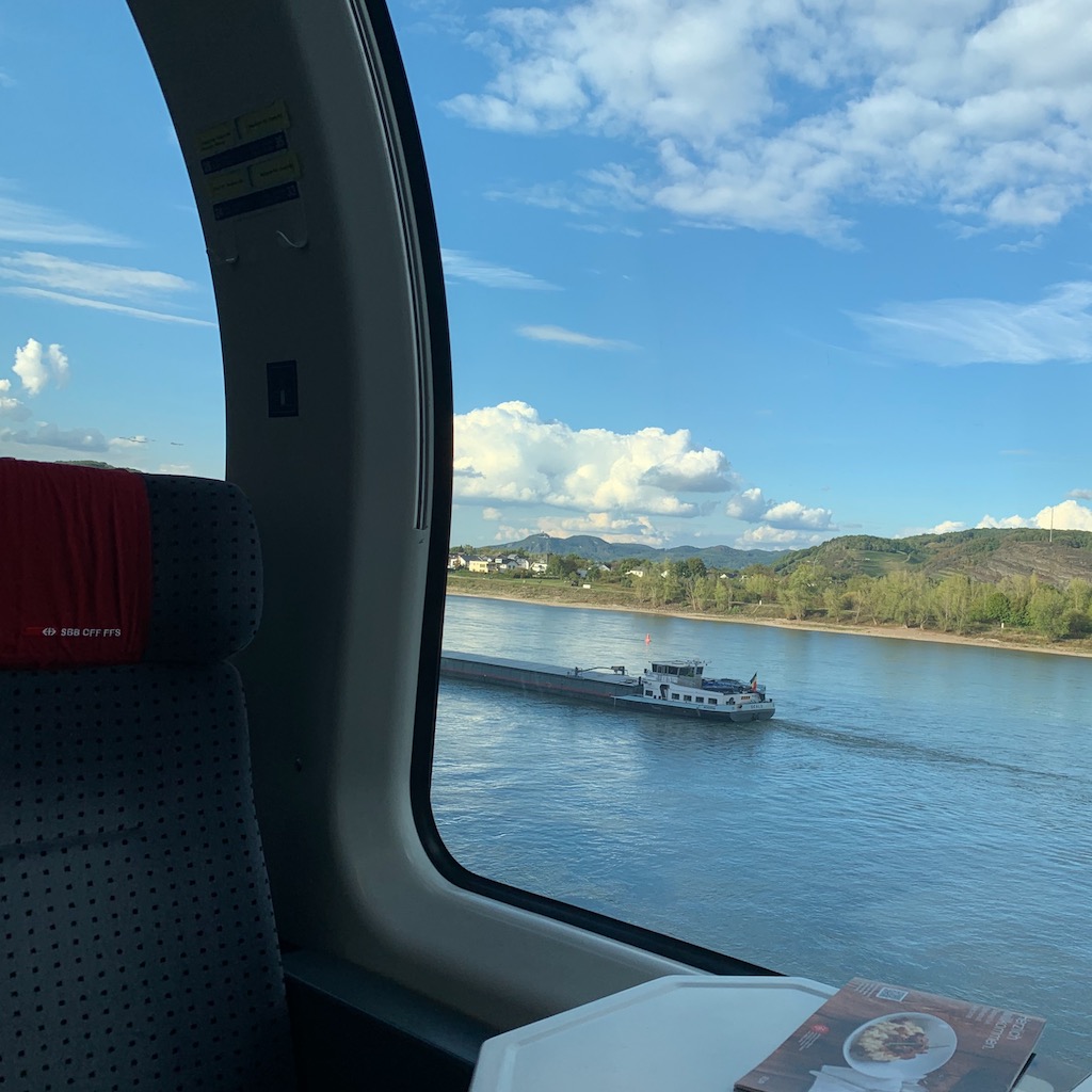 Ab Mannheim wurde mir das außergewöhnliche Vergnügen zuteil, in einem Panoramawagen der Schweizer Bundesbahn Platz zu nehmen. Eine angenehmere Art zu reisen ist kaum denkbar, obwohl man sich auch hier gegenüber sitzt, immerhin ohne diesen beengenden Tisch dazwischen.