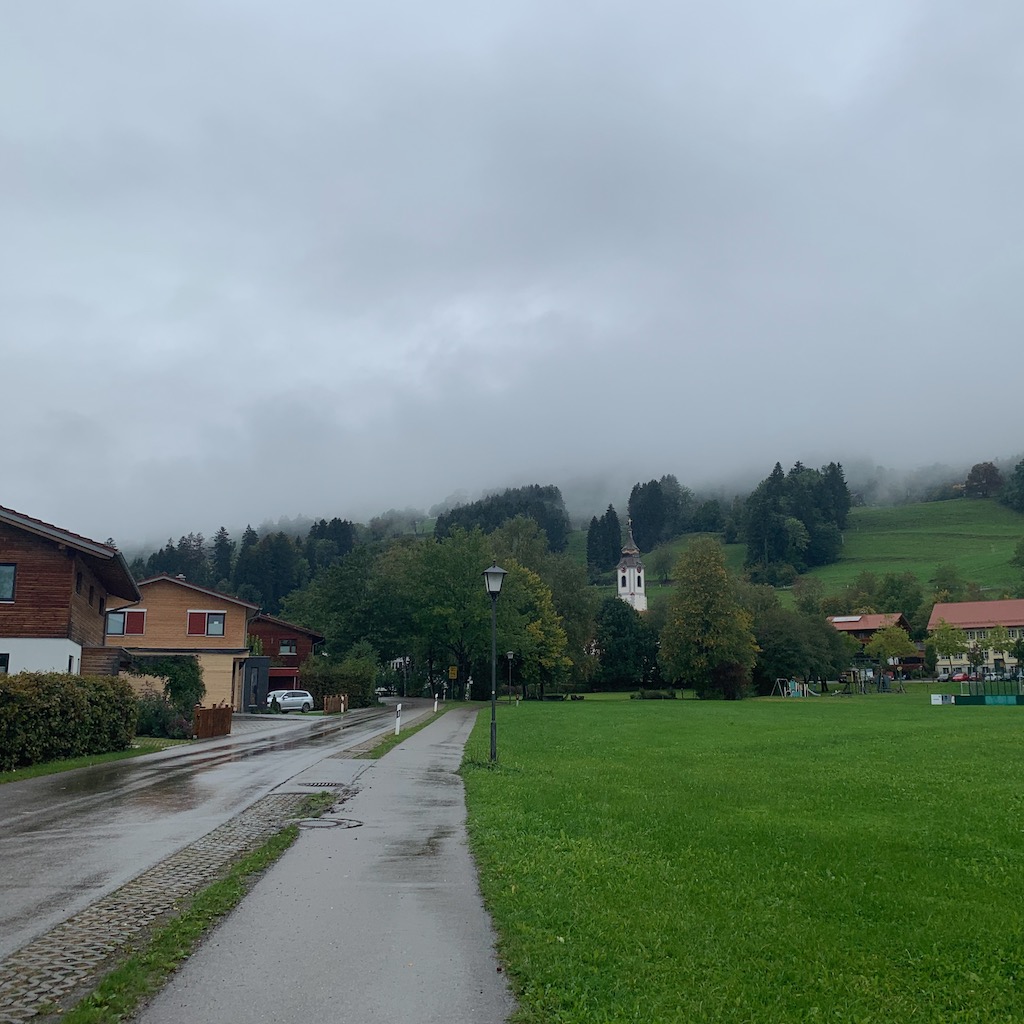 Es regnete durchgehend den ganzen Tag, wie angekündigt. Das hielt mich nicht von einem längeren Spaziergang durch Oberdorf und Martinszell ab; nach monatelanger Vorfreude blieb ich nun nicht wegen Fußfeuchtegefahr im Zimmer. Nach Rückkehr waren die Schuhe komplett durchnässt, das war es wert. Vielleicht sollte ich mir mal wasserdichte Wanderschuhe zulegen.