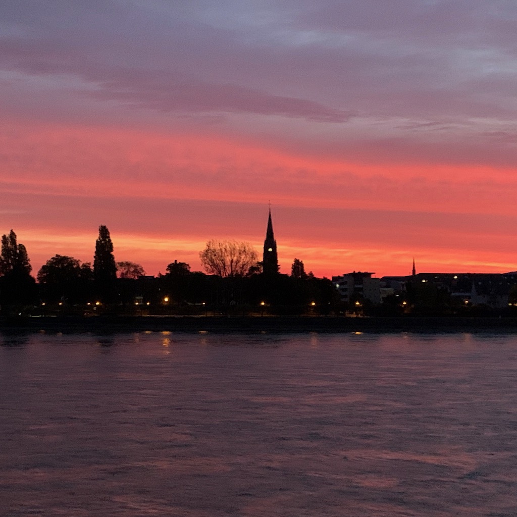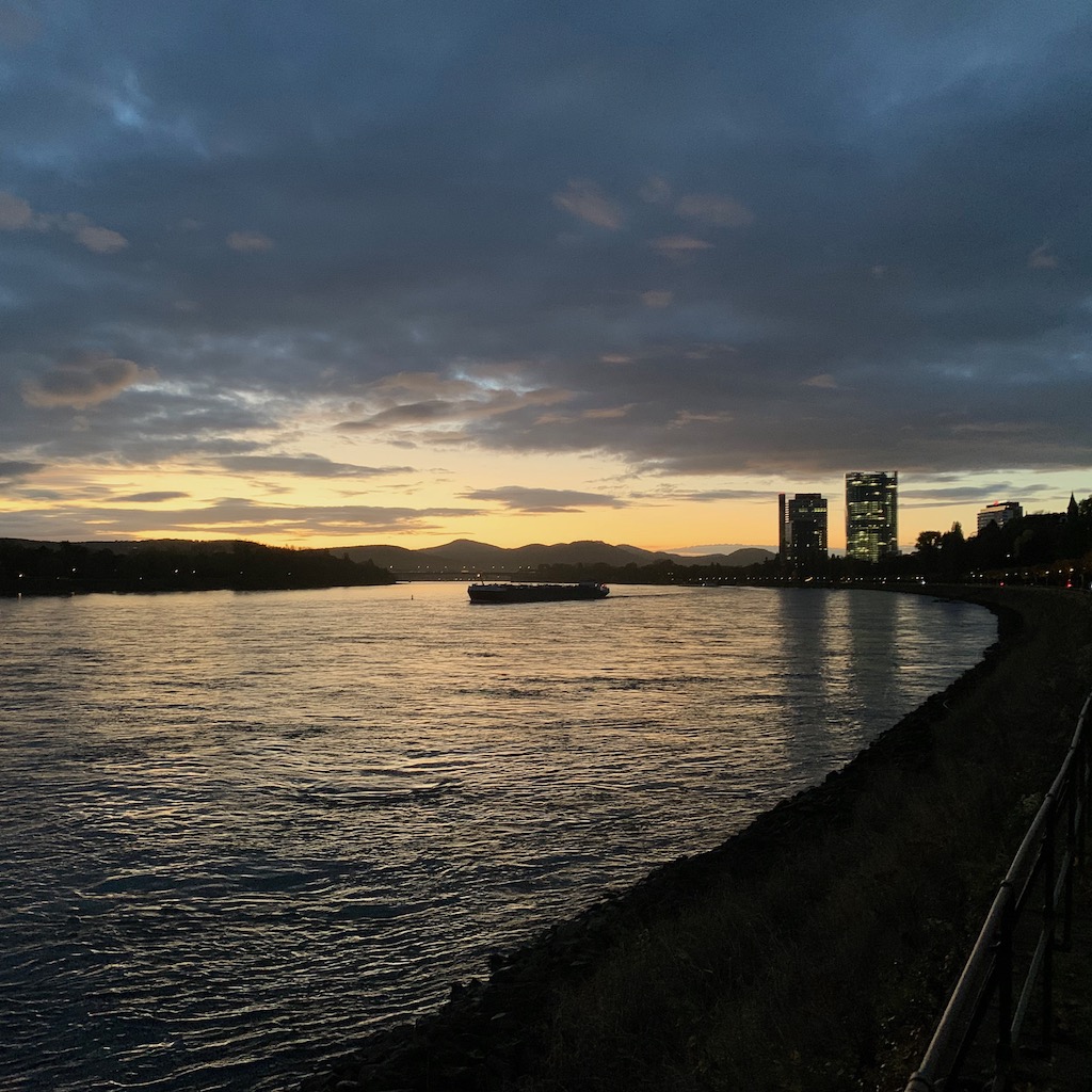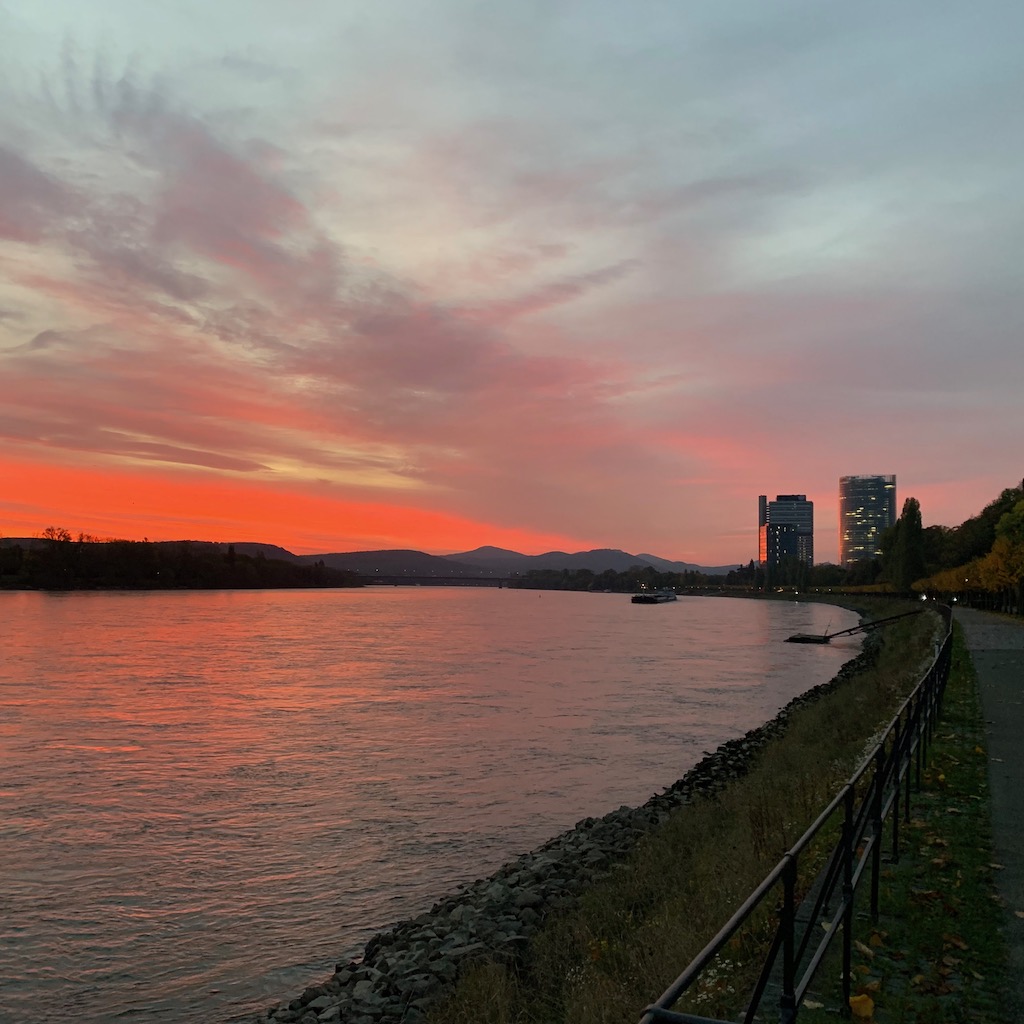 Aufgrund der aktuellen Wetterlage waren beide Rheinufer von mehr oder weniger sommerlich bekleideten Menschen zu Fuß und zu Fahrrad bevölkert. Zurück auf der Bonner Seite endete der Spaziergang mit dem in diesem Jahr voraussichtlich letzten Besuch des Lieblingsbiergartens, wo ich die persönliche Untergangsstimmung bei einem kühlen Hellen genoss.