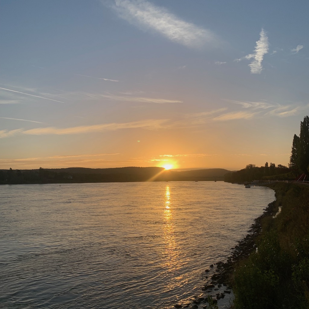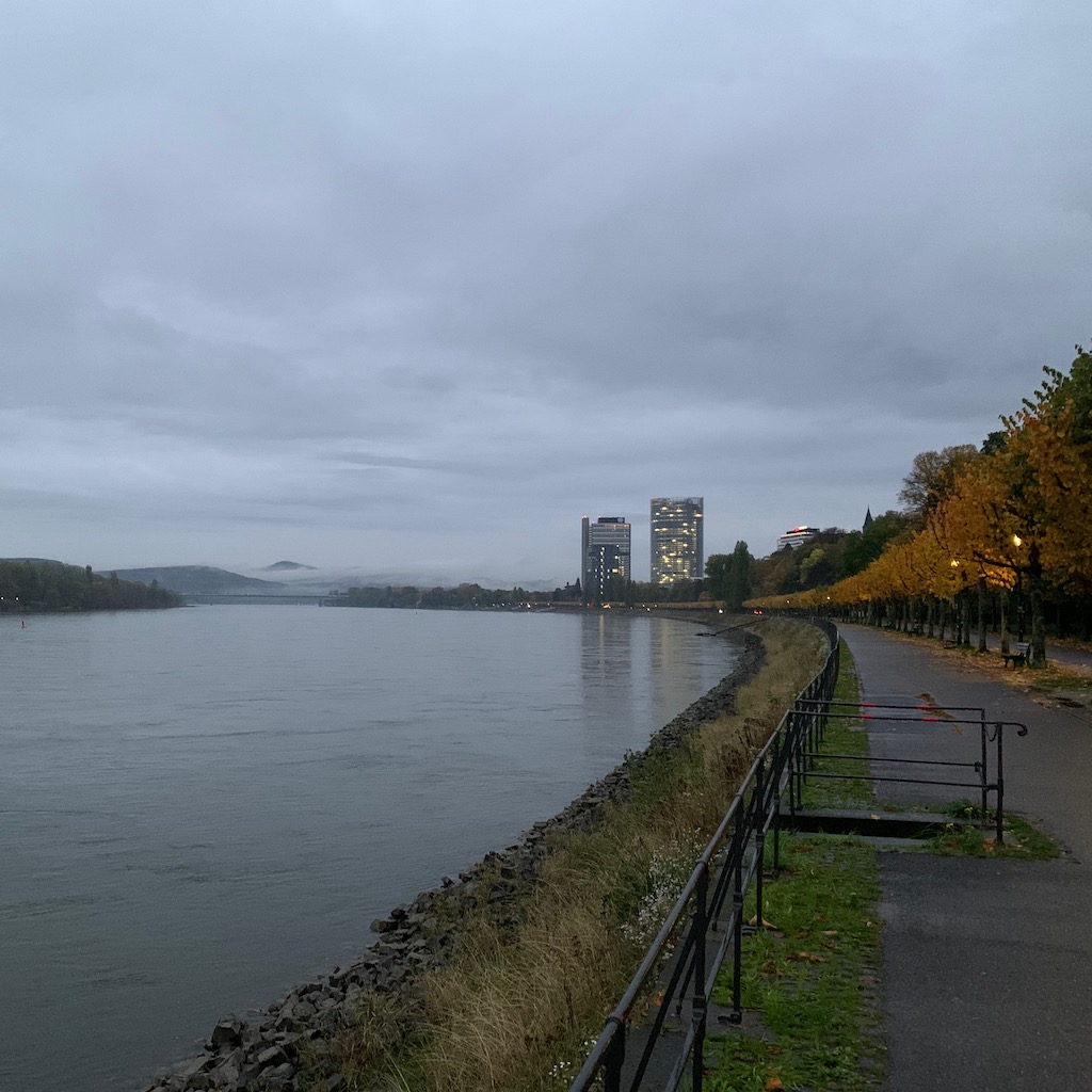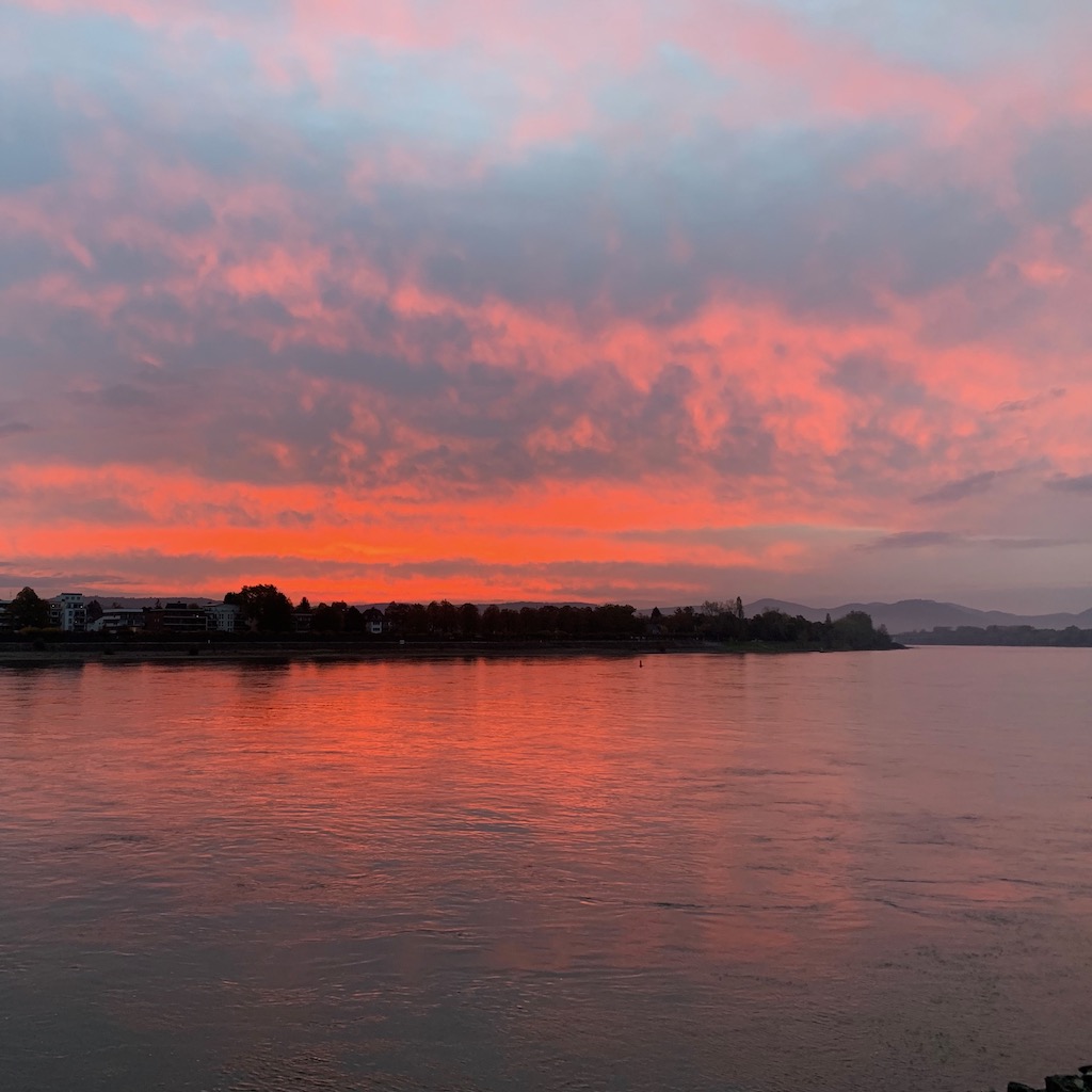 Aufgrund der aktuellen Wetterlage waren beide Rheinufer von mehr oder weniger sommerlich bekleideten Menschen zu Fuß und zu Fahrrad bevölkert. Zurück auf der Bonner Seite endete der Spaziergang mit dem in diesem Jahr voraussichtlich letzten Besuch des Lieblingsbiergartens, wo ich die persönliche Untergangsstimmung bei einem kühlen Hellen genoss.