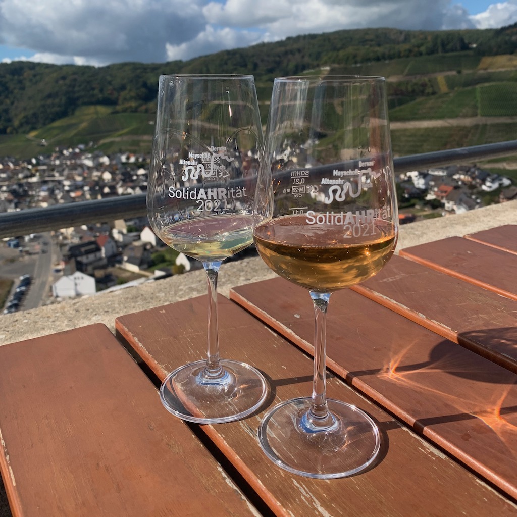 Im Hintergrund das noch immer von den Zerstörungen der Flut gezeichnete DernauOberhalb von Dernau scheint die Weinwelt in Ordnung