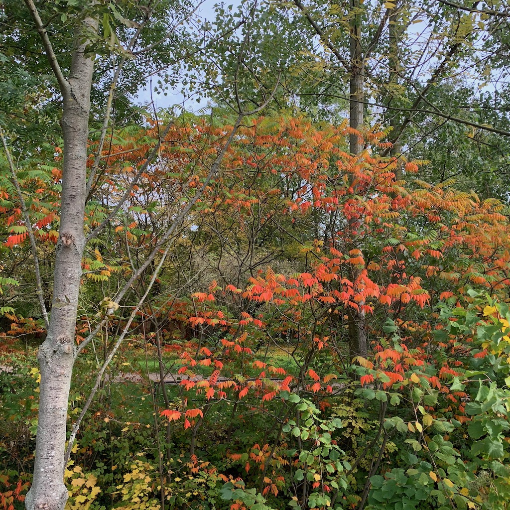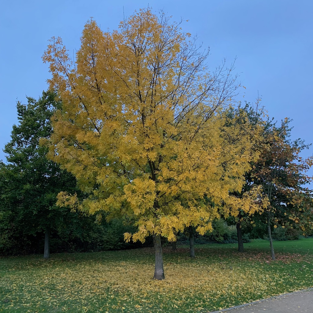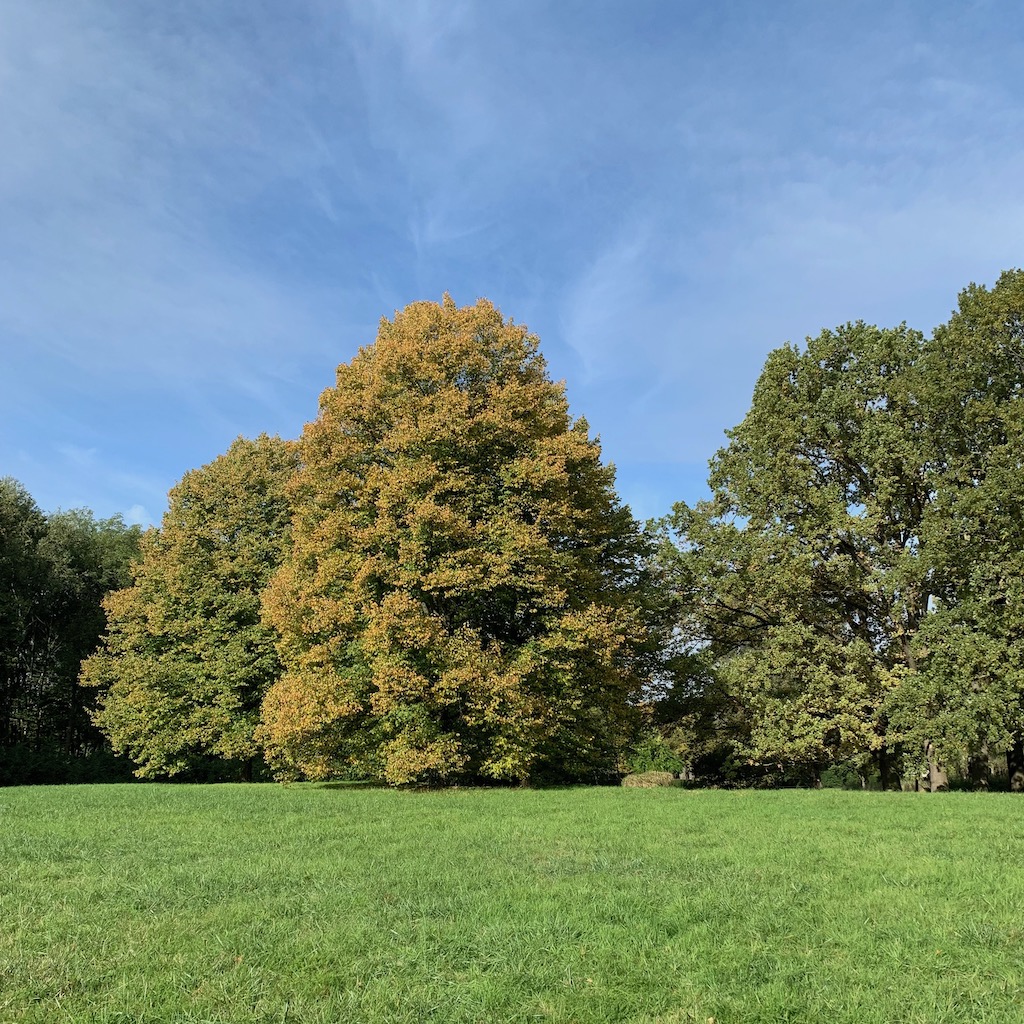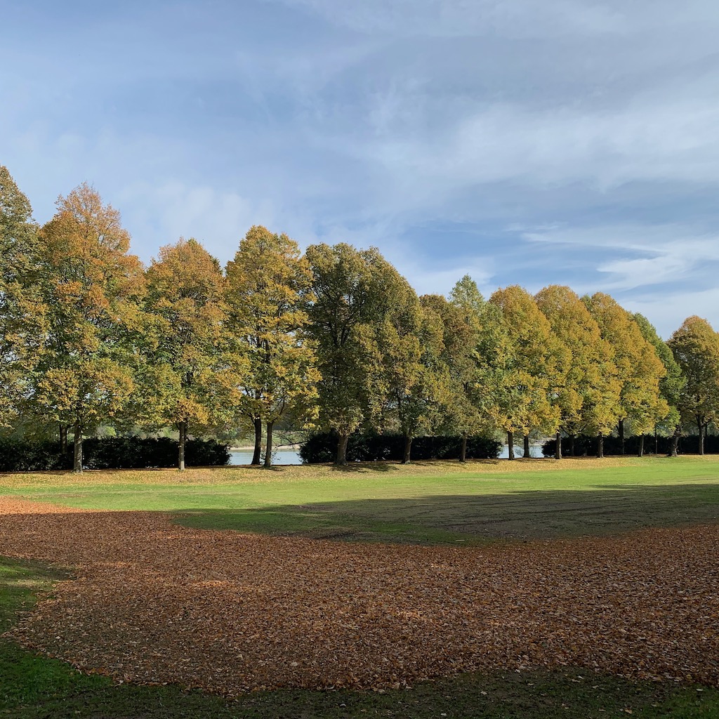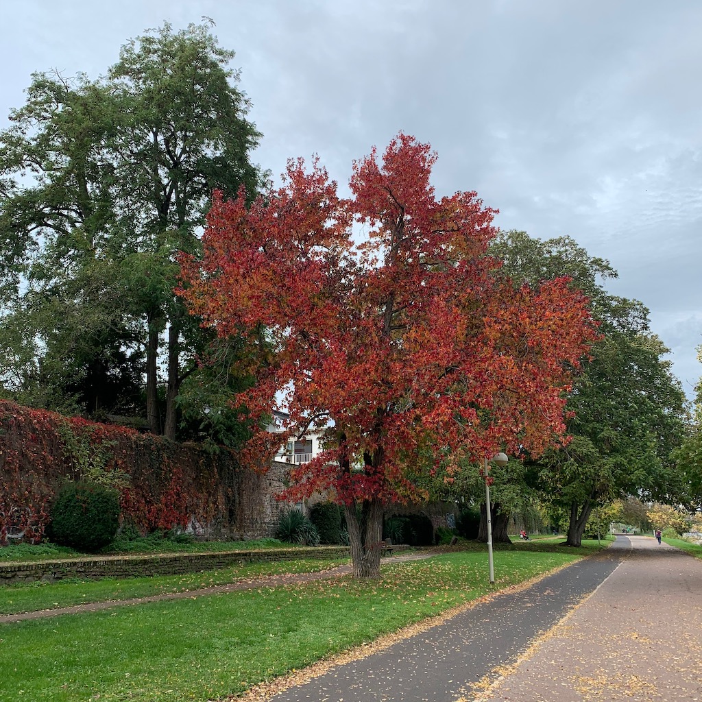 Nach dem Essen ging ich eine Runde durch den Park, wo der Herbst nun langsam beginnt, die verbliebenen, im Sommer noch nicht vorzeitig abgeworfenen Blätter bunt zu färben. Er ist spät dran, oder kommt mir das nur so vor?