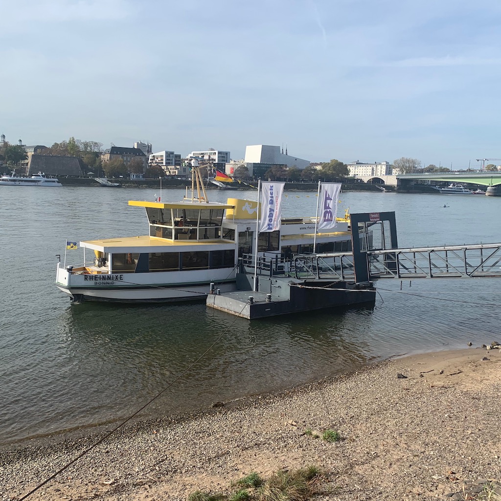 Sonntag: Die Rheinnixe hat ausgedient. Jahrzehntelang verband sie das Bonner Rheinufer mit Bonn-Beuel. Nachdem der Fährmann seine letzte Überfahrt ins Jenseits angetreten hat, findet sich niemand, der den Job übernimmt, auch sollen die Fahrgastzahlen rückläufig sein. Deshalb haben sich die Betreiber entschlossen, die Verbindung einzustellen. Ich habe sie höchstens zwei- oder dreimal benutzt; mir leuchtete nicht ein, sich gegen – wenn auch geringes – Entgelt mit der Fähre ans andere Ufer bringen zu lassen, wenn man auch entgelt- und wartezeitfrei die naheliegende Brücke nutzen kann. Trotzdem schade, mit der Rheinnixe verschwindet ein kleines Stück Bonn. Jetzt ist sie am Beueler Ufer festgemacht und harrt ihrem weiteren Schicksal entgegen. Es ist vermutlich nur eine Frage der Zeit, bis die üblichen Idioten damit beginnen, sie zu beschmieren und die Scheiben einzuschlagen.