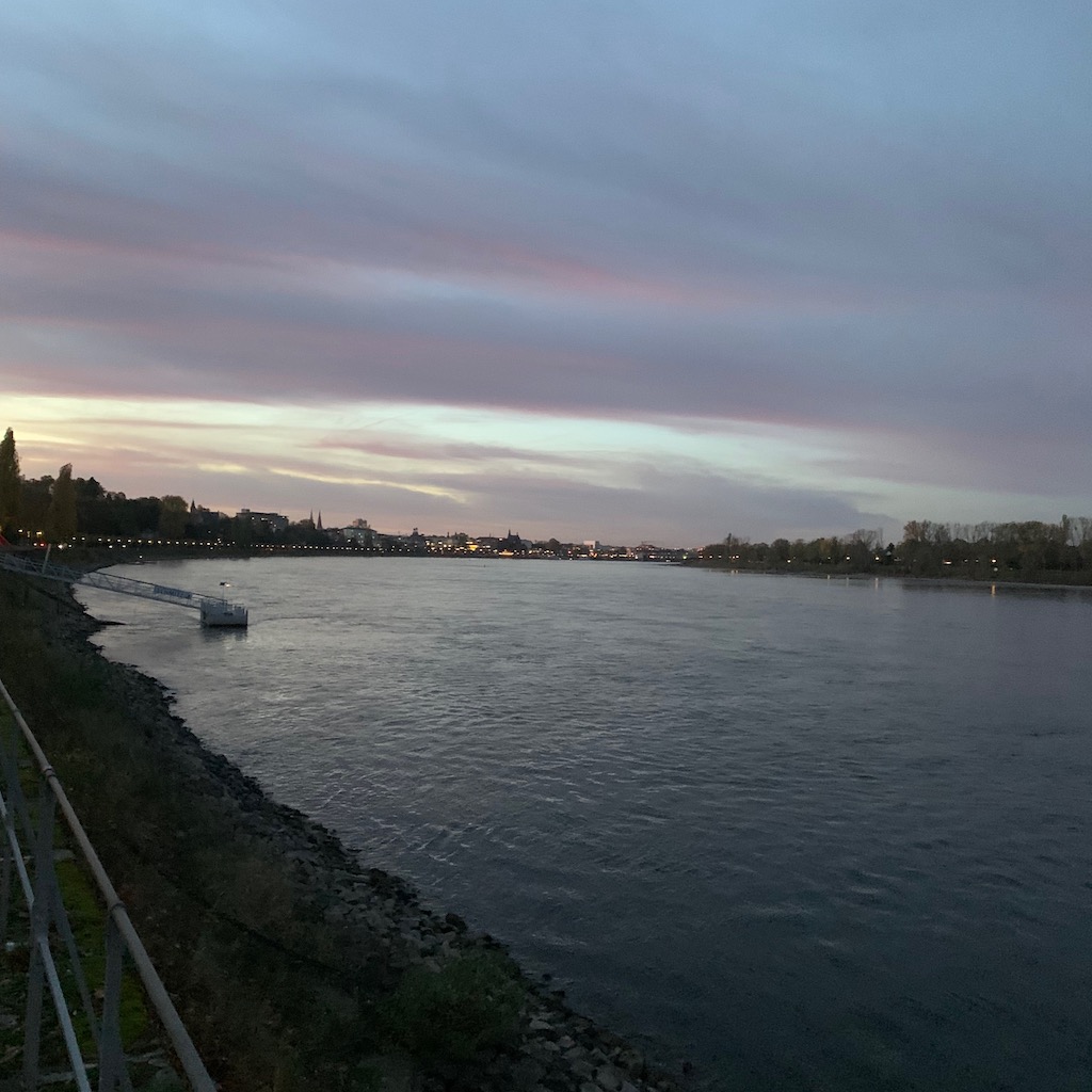 Am Rheinufer kam mir ein jüngeres gemischtes Paar eingehakt entgegen. Wenige Meter vor unserer Begegnung griff sie an die ihr abgewandte Wange ihres Begleiters und zog sein Gesicht zu sich hin, um einen Kuss anzufordern und zu bekommen, keinen langen Knutscher Jungverliebter, sondern einen kurzen Wegekuss. Als wollte sie signalisieren, dass sie bereits vergeben ist. Vielleicht hatte sie mich auch durchschaut und wollte mir zu verstehen geben, dass er vergeben ist. Die Welt ist voller Missgunst.