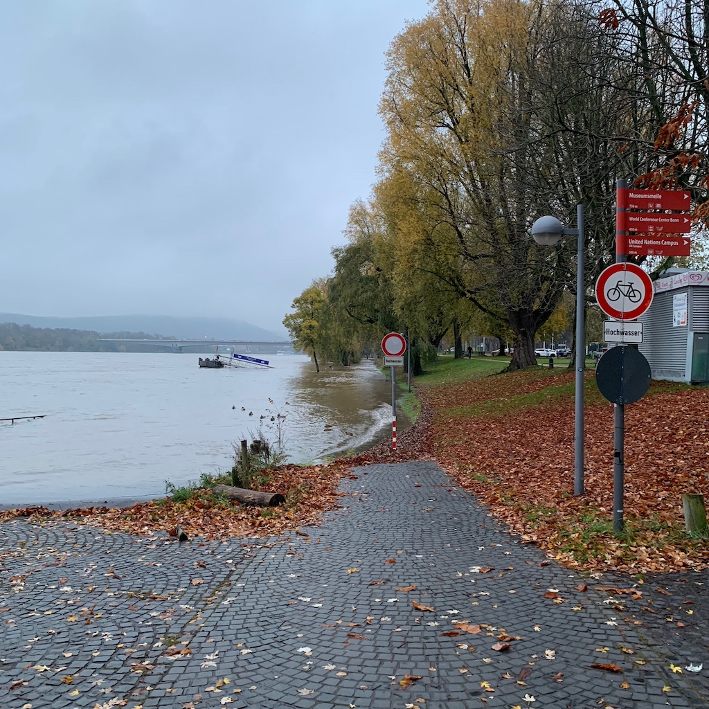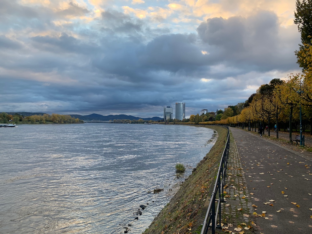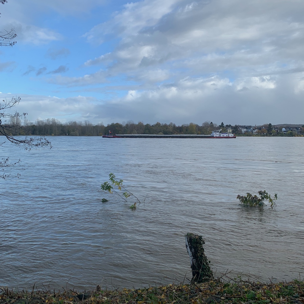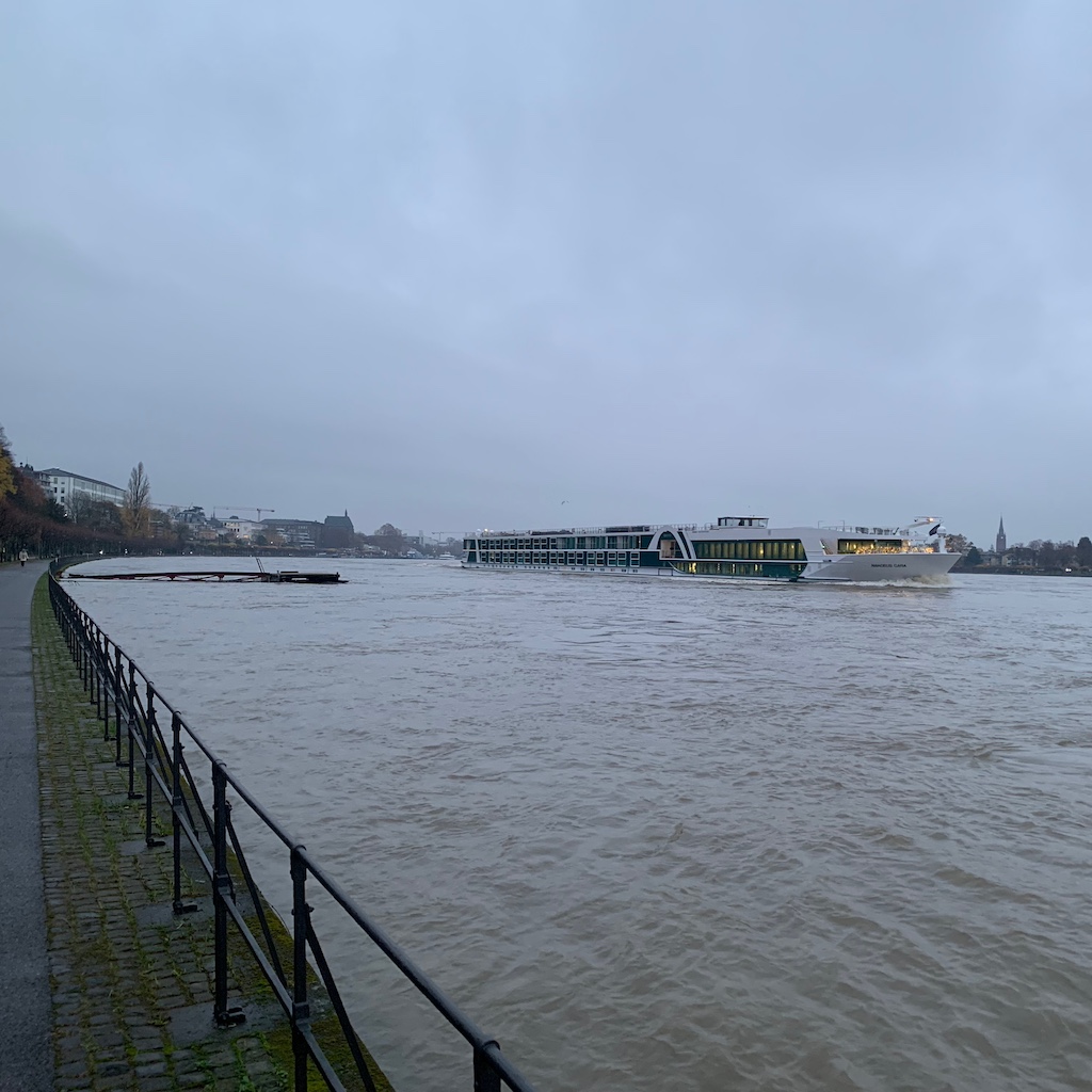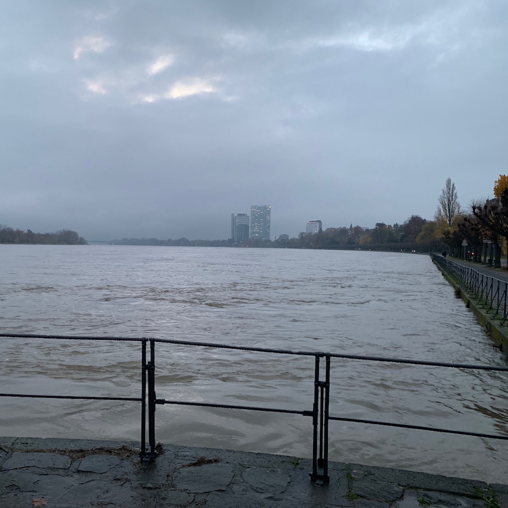 Dienstag: Dienstag ist Zufußtag, und also ging ich zu Fuß ins Werk und zurück, entlang dem noch immer hochwässrigen Rhein. Auf dem Rückweg hielt ich nach längerem mal wieder Einkehr auf einen Tee (jawohl!) im Rheinpavillon. Dort waren bei Ankunft die meisten Tische reserviert für eine größere Gruppe, weshalb ich mit einem Platz nahe dem Eingang vorlieb nahm, wo es jetzt schon wieder recht kühl ist. Kurz darauf trafen nach und nach die Gäste ein, es wurde immer lauter. Ab der kommenden Woche gibt es dort im Außenbereich wieder Glühwein; die Verkaufsbude ist bereits aufgestellt, aber noch geschlossen.