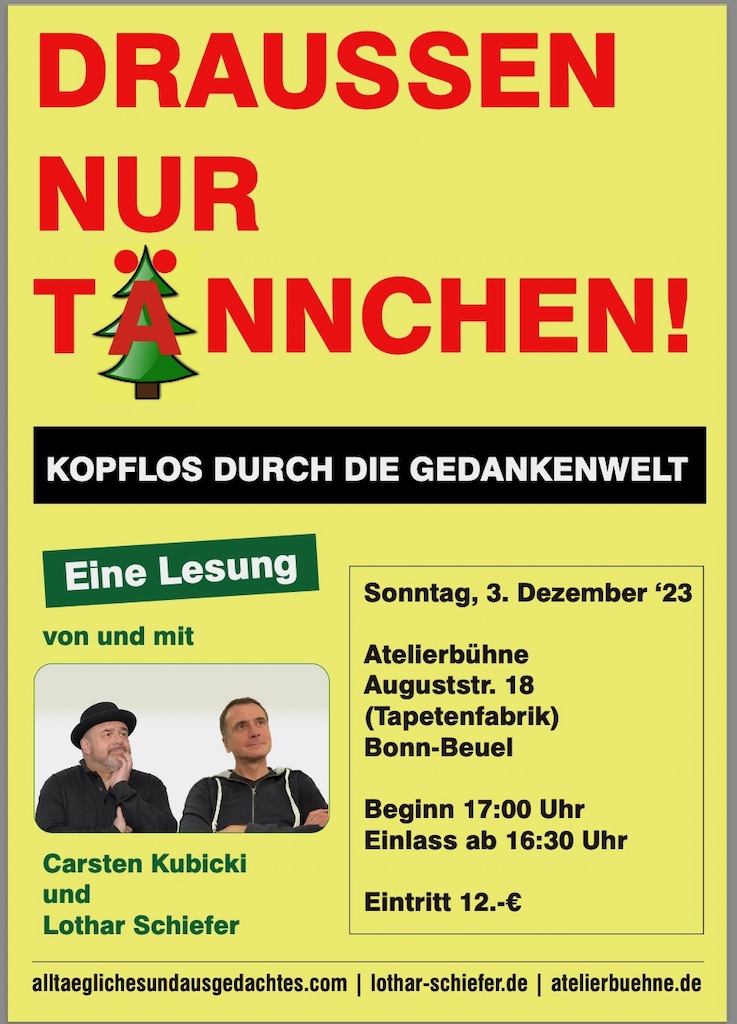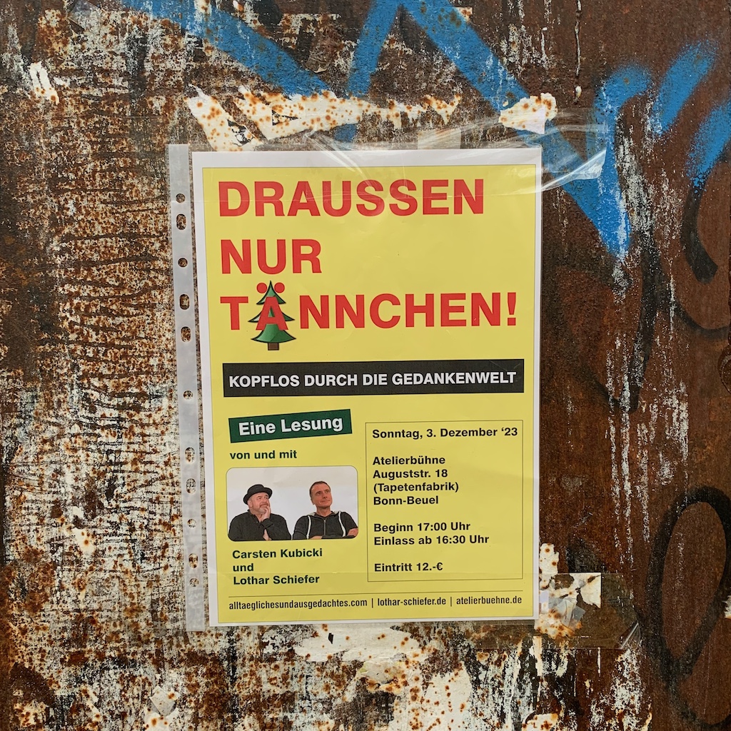 Zurück bei leichtem Regen zu Fuß, damit war der Sonntagsspaziergang auch erledigt. In der Inneren Nordstadt eine kleine Überraschung: Das am vergangenen Sonntag an einem öffentlichen Bücherschrank halblegal angebrachte Plakat für die Lesung nächsten Sonntag war noch nicht entfernt.