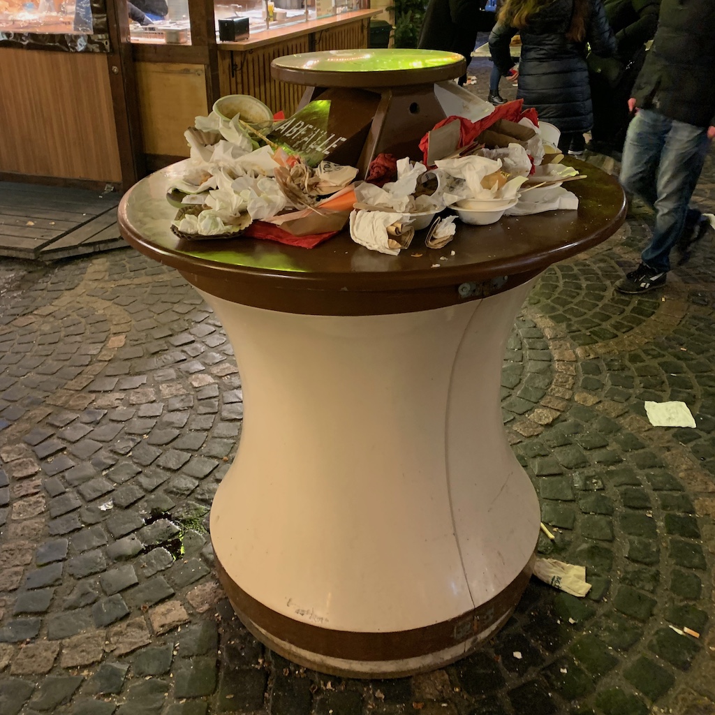 Donnerstag: Abends trafen wir uns mit einer Sektion der Karnevalsgesellschaft auf dem Weihnachtsmarkt, derweil Sturmtief Zoltan zürnte. Nicht schlimm, für uns war ein Tisch reserviert im Hinterzimmer einer Budengaststätte ungefähr von der Größe unserer Küche, nur voller Menschen, wohingegen größere Menschenansammlungen in unserer Küche seit mehreren Jahren nicht mehr vorkommen, was keineswegs zu beklagen ist. Neben uns in der Stube traf sich eine etwa dreißigköpfige Gruppierung eines anderen Bonner Karnevalsvereins, zu deren Zugangsvoraussetzungen offenbar gehört, eine Sprechstimme von mindestens hundertzwanzig Dezibel vorzuweisen. Mit anderen Worten: Es war unangenehm laut. Mit zunehmendem Alter behagt es mir immer weniger, mich in geschlossenen Räumen aufzuhalten, wo mehr als zehn Personen durcheinander reden. Erst recht, wenn dazu laute Musik, schlimmstenfalls Livemusik gespielt wird, wovon heute Abend zum Glück abgesehen wurde.