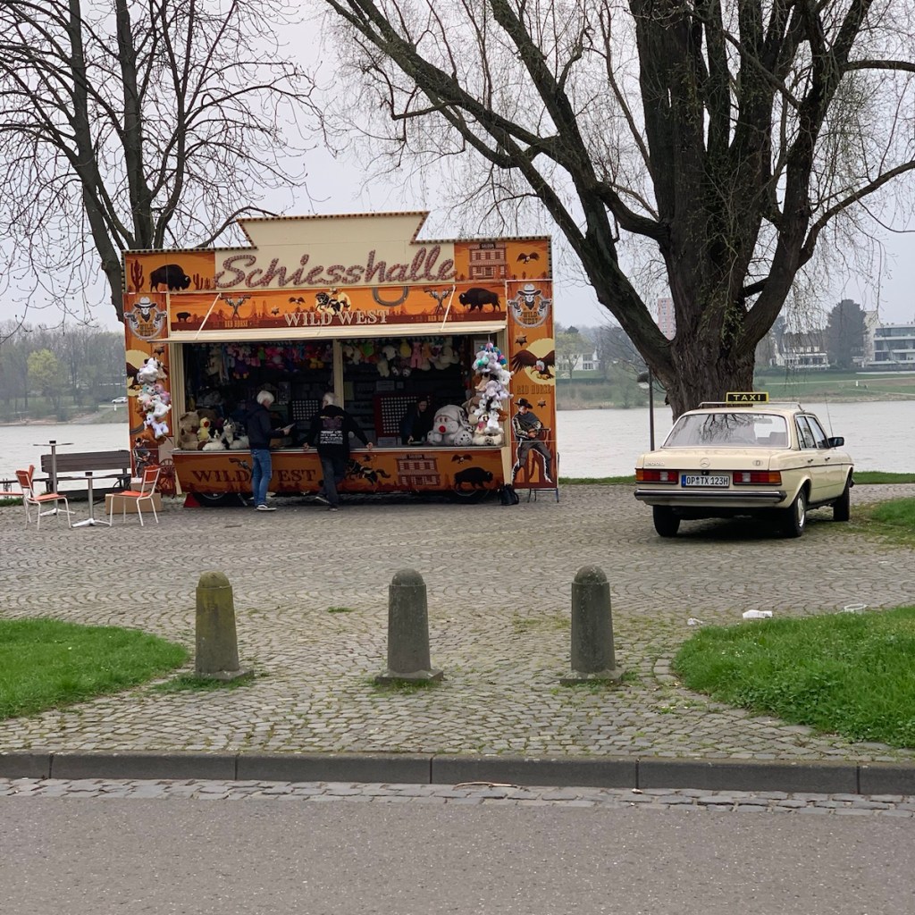 Donnerstag: Am Rheinufer wurde morgens eine Schießbude aufgebaut, davor stand ein Taxi aus vergangenen Zeiten. Wenig später verstand ich: Sie waren Bestandteil von Dreharbeiten für eine ZDF-neo-Serie, wie ein an einem Pfahl angebrachter Aushang informierte. We häufig mag ich mich schon über Dinge am Wegesrand gewundert haben, bei denen es sich in Wahrheit um Filmrequisiten handelte. Manchmal dann für einen ziemlich schlechten Film.