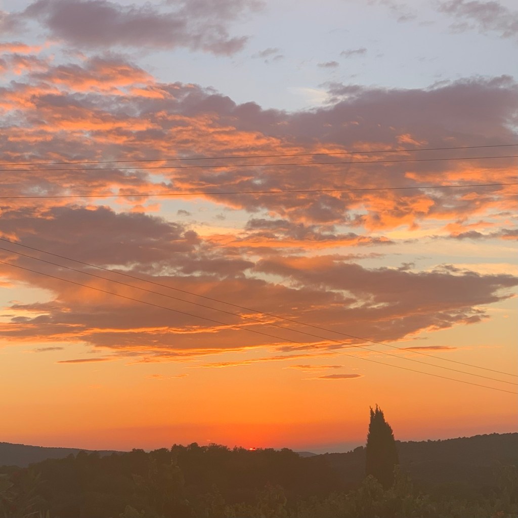 Abendessen erstmals in einem sehr netten Bistrot in Beaumont-du-Ventoux, hin und zurück mit den Fahrrädern. Während der Rückfahrt wurde beeindruckendes Abendrot geboten.