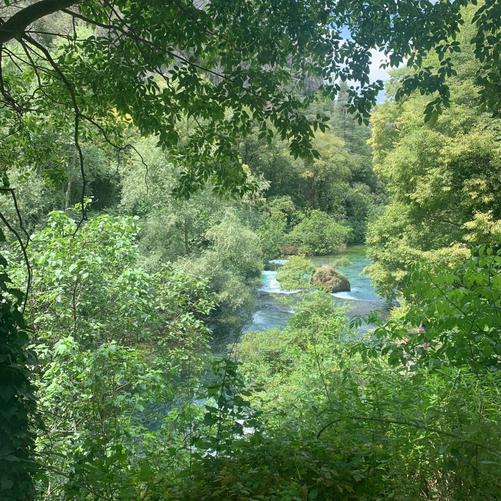 Weiter ging es nach Fontaine-de-Vaucluse, um einen Blick in das Quellbecken zu werfen. Dieser wurde dem geneigten Touristen verwehrt, etwa hundert Meter vor der Naturattraktion versperrt eine massive Holzbarriere den Weg wegen Steinschlaggefahr. Auch das war verschmerzbar, aus Vorjahren kennen wir die Quelle in allen Pegelständen. Ungetrübt dagegen das Vergnügen einer Einkehr in das nahe Restaurant Philip, eine der schönsten mir bekannten Gaststätten direkt an und mit Blick auf die soeben entsprungene Sorgue.