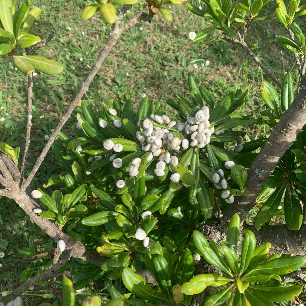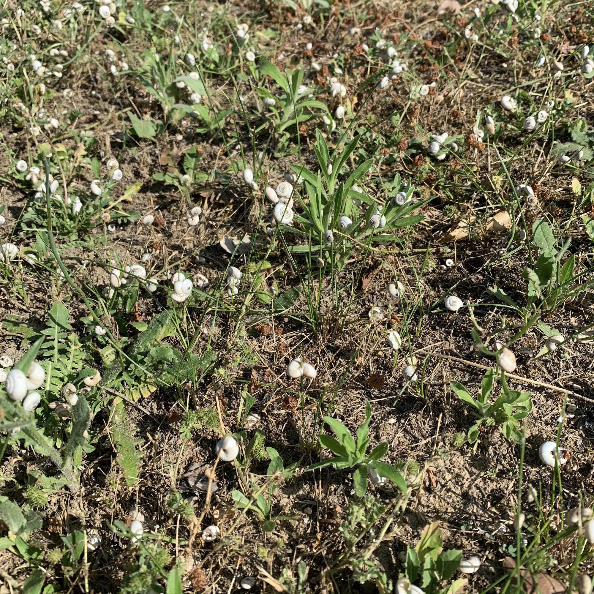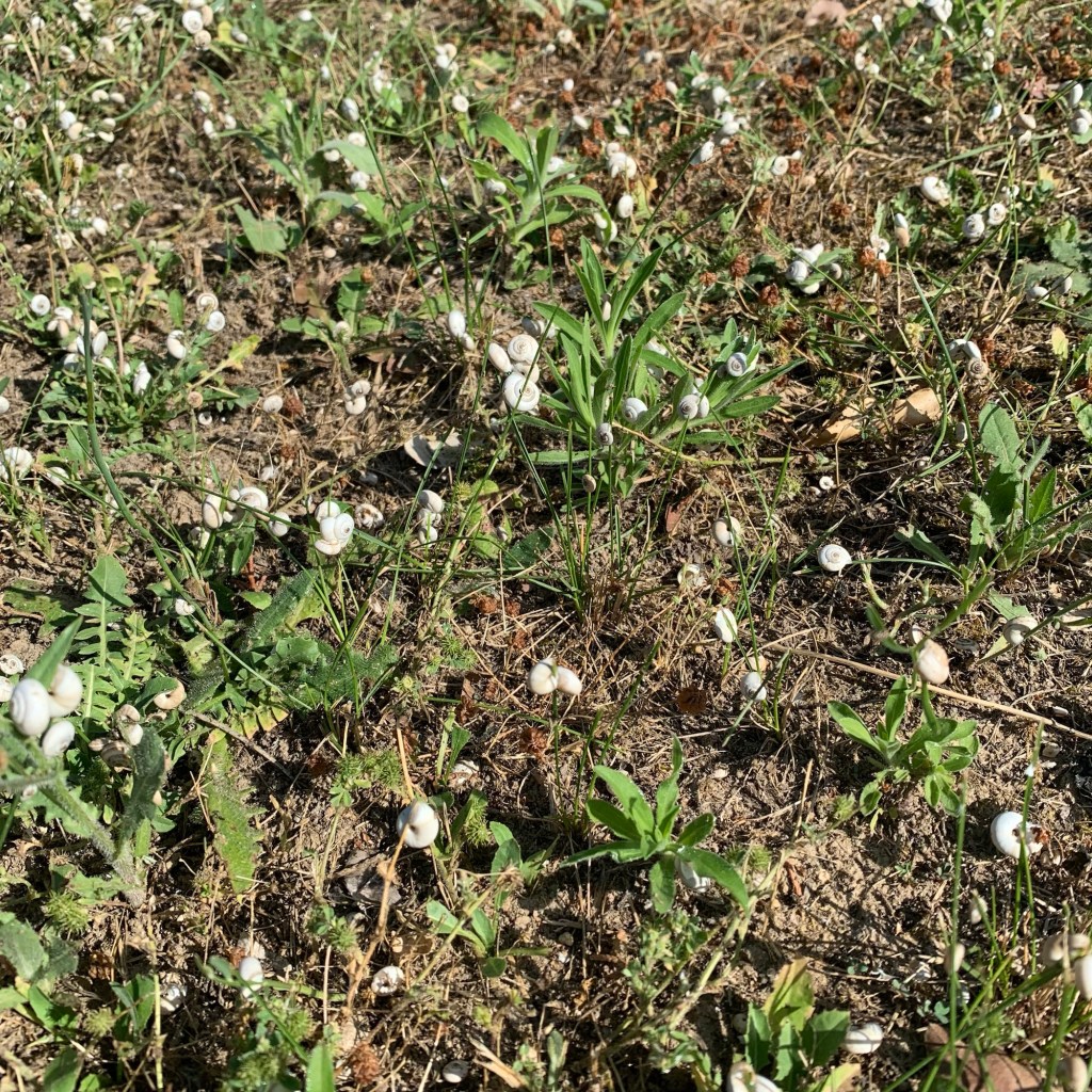 Freitag: Auch den letzten Urlaubstag verbrachten wir ohne besondere Aktivität bei erheblicher Hitze. Nach dem Frühstück trug ich zum letzten Mal den Liegestuhl in den Garten unter die Zypresse, um mich der Lektüre zu widmen und am Dasein zu erfreuen. Die Rasenfläche drumherum ist übersät mit kleinen weißen Schnecken zwischen wenigen Millimetern und maximal etwa einem Zentimeter Größe. Nicht hunderte, es müssen tausende sein, die regungslos an den Halmen harren und dort die Hitze verschlafen, an manchen Büschen in größeren Gruppierungen. So viele, dass es nicht möglich ist, den Garten zu betreten, ohne einige von ihnen zu zertreten, wie sie, vergeblich, durch sanftes Knacken unter jedem Schritt kundtun. Tut mir leid.