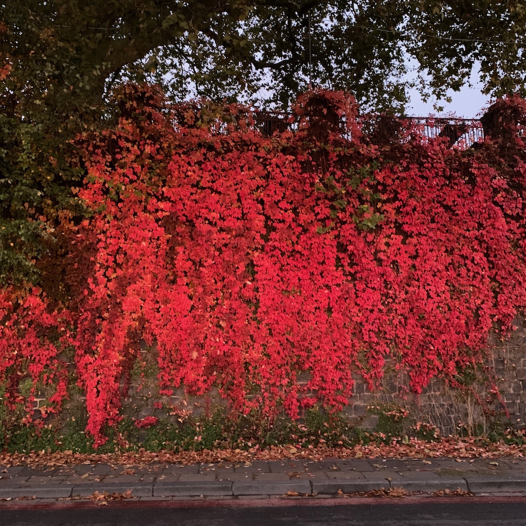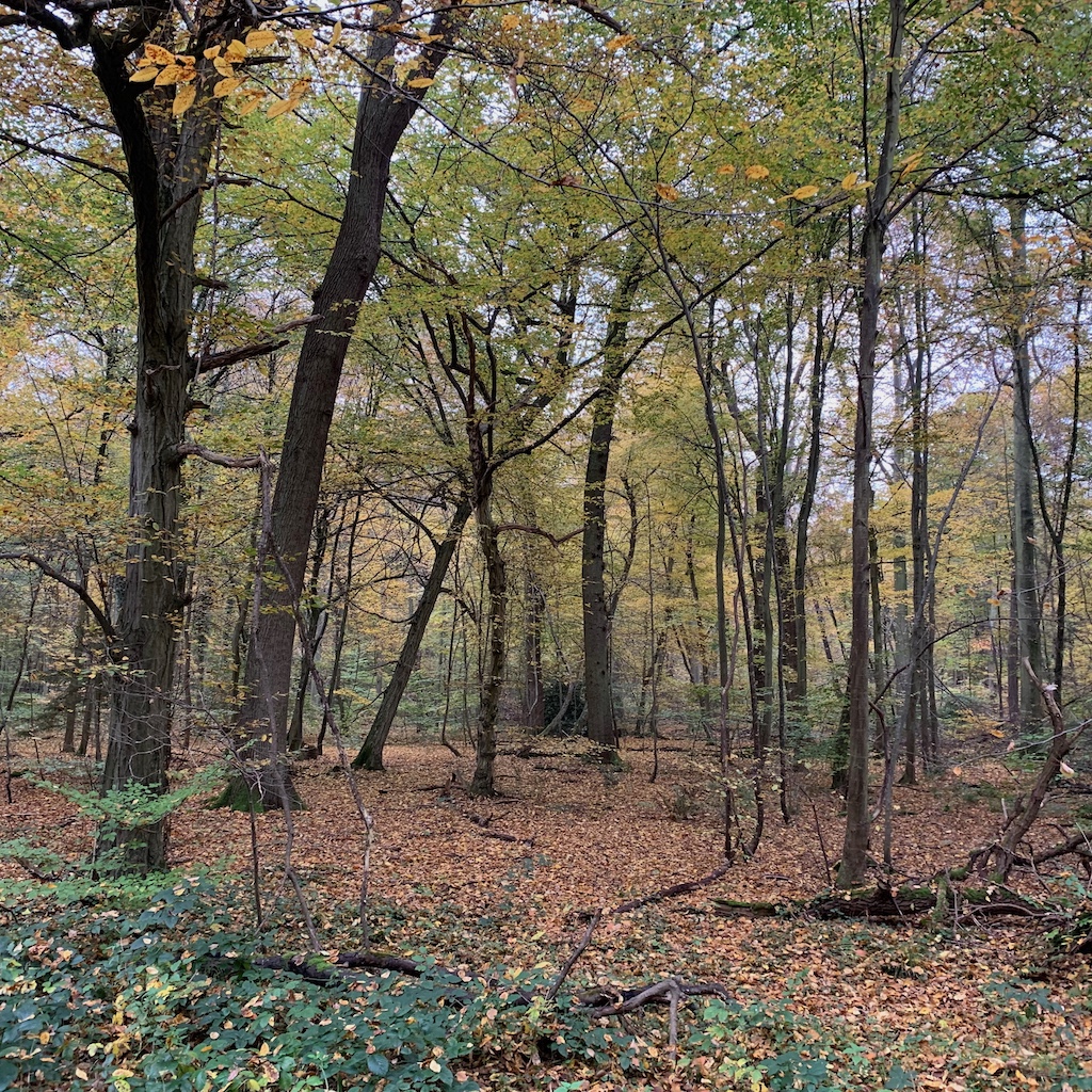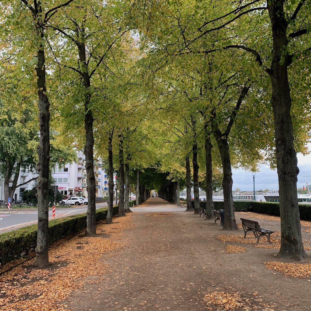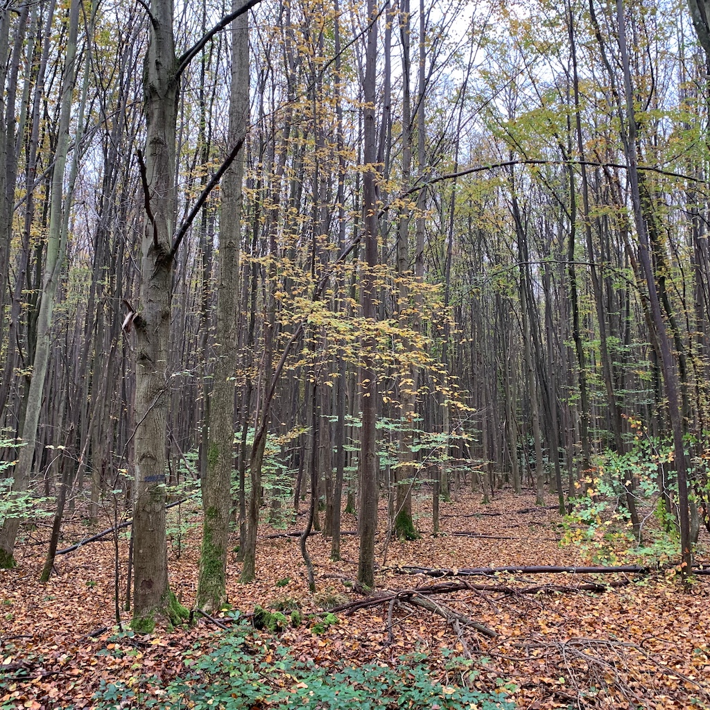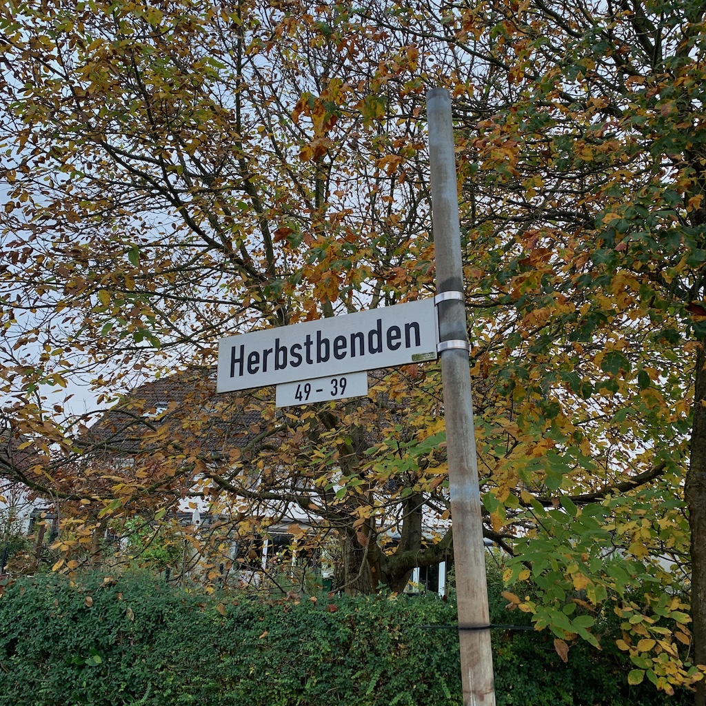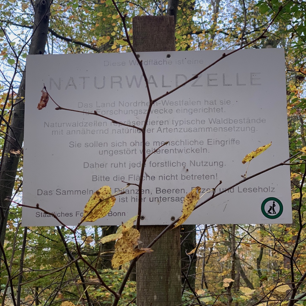 Nach Proviantkauf und einem schmalen Frühstück in einer bahnhofsnahen Bäckerei fuhr ich mit der Bahn nach Alfter-Witterschlick, ein Ortsname, der wie eine akute Magen-Darm-Verstimmung klingt, wer auch immer sich den ausgedacht hat. Von dort wanderte ich durch den Kottenforst zurück in Richtung Bonn. Der Weg führte fast ausschließlich durch herbstbuntes Waldgebiet.