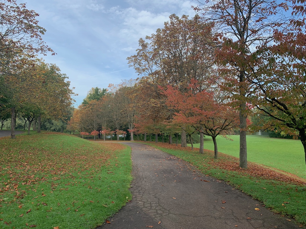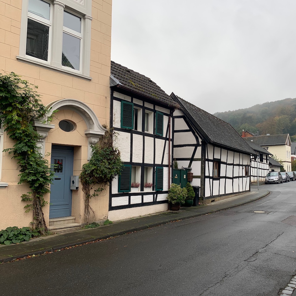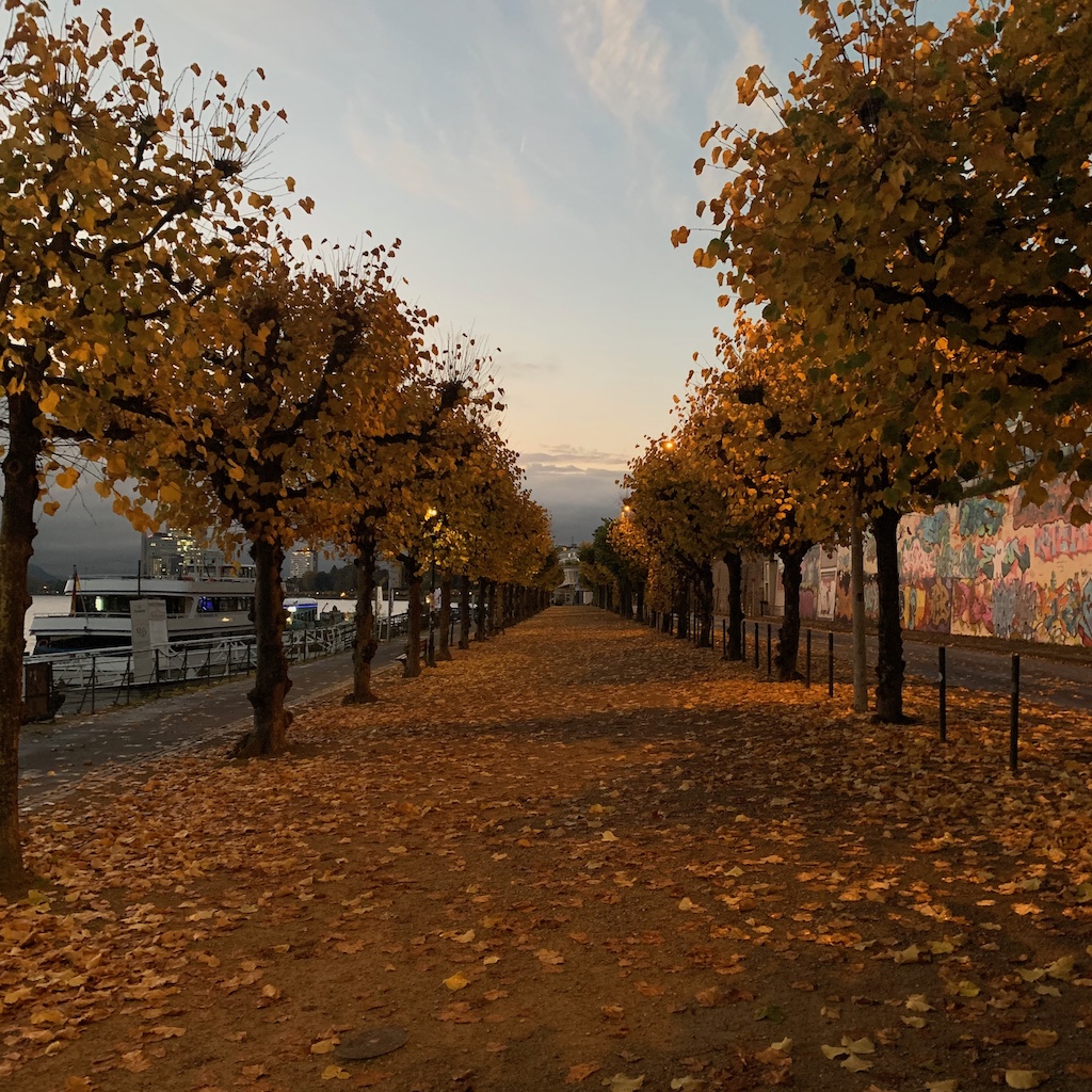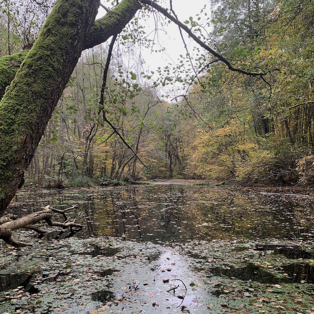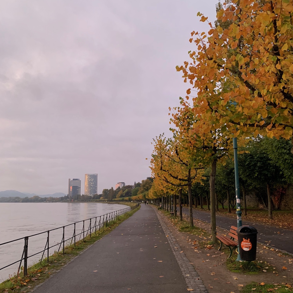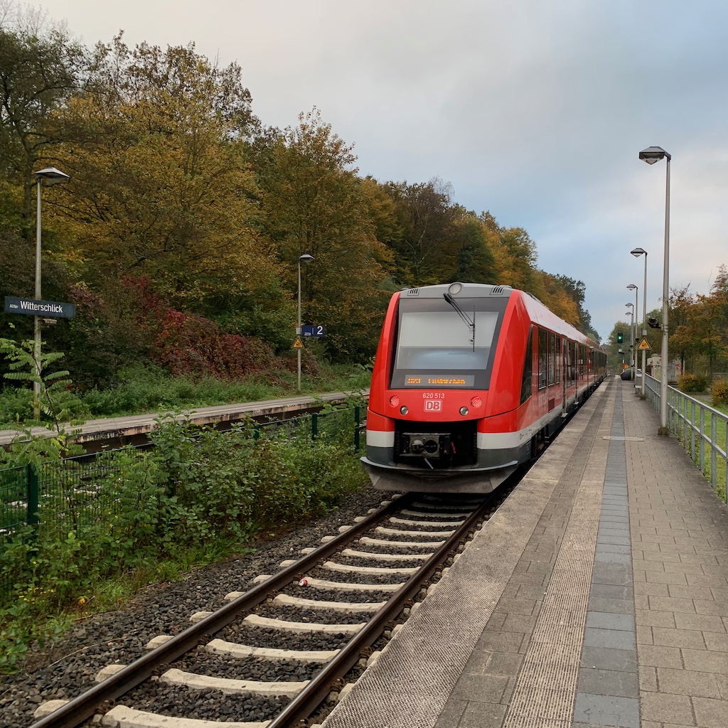 Nach Proviantkauf und einem schmalen Frühstück in einer bahnhofsnahen Bäckerei fuhr ich mit der Bahn nach Alfter-Witterschlick, ein Ortsname, der wie eine akute Magen-Darm-Verstimmung klingt, wer auch immer sich den ausgedacht hat. Von dort wanderte ich durch den Kottenforst zurück in Richtung Bonn. Der Weg führte fast ausschließlich durch herbstbuntes Waldgebiet.