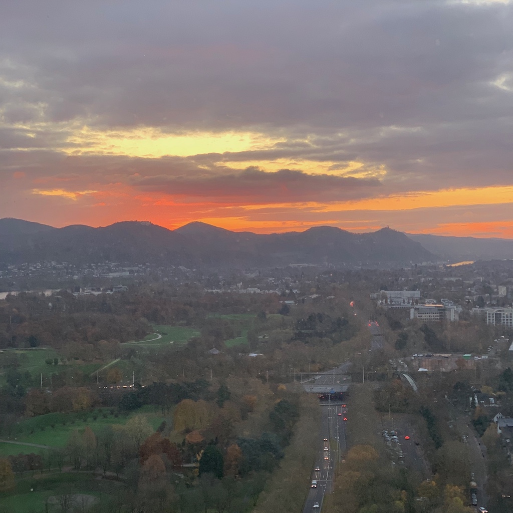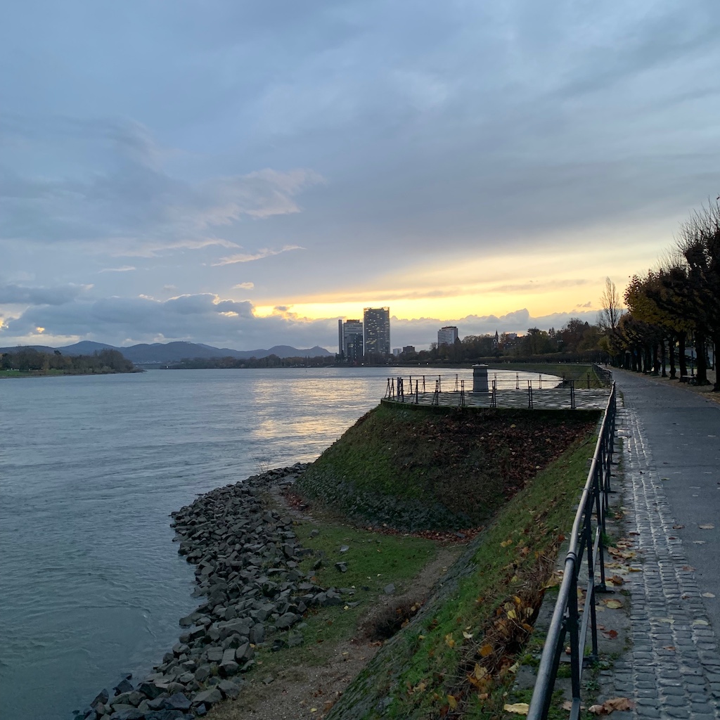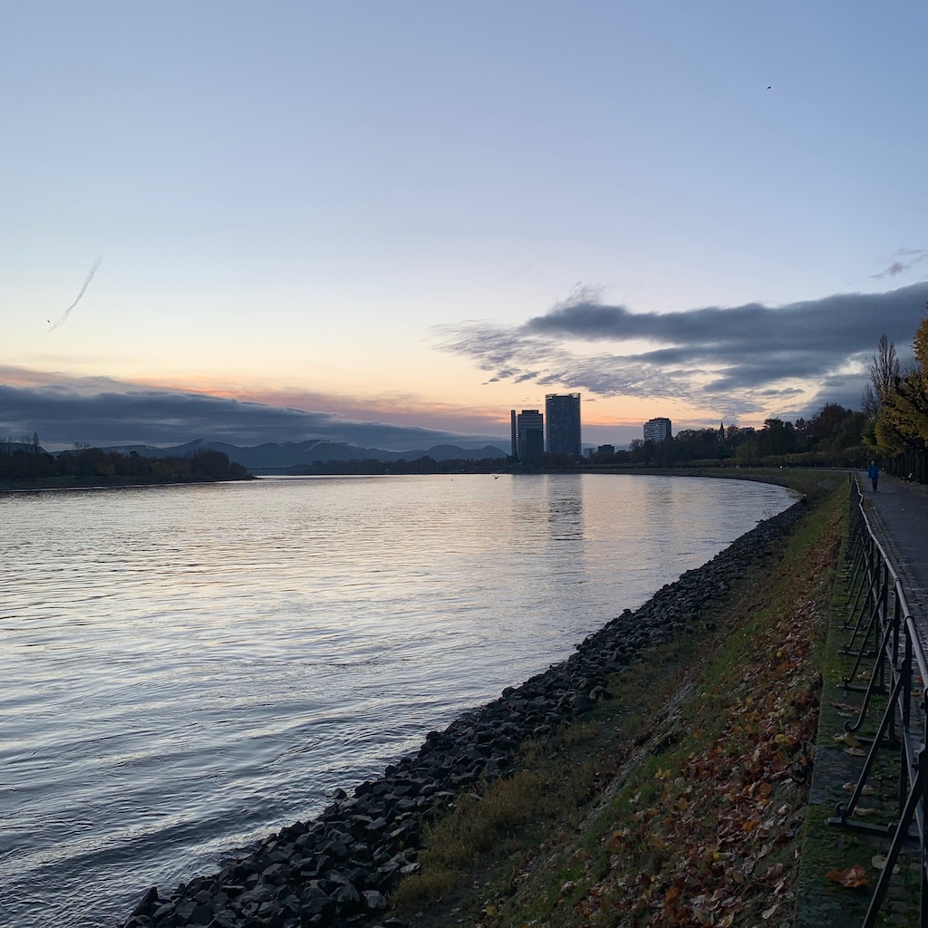 Abends aß ich den ersten Grünkohl der Saison, der traditionell im Winterhalbjahr gegessen wird, wohingegen Erbsensuppe zu jeder Jahreszeit zulässig ist. Erste Winteranmutung kam auf dem Weg zur Gaststätte beim Überqueren der Rheinbrücke auf, wo uns kalter Wind aus Süden mangels Handschuhen die Hände tief in die Hosentaschen versenken ließ.