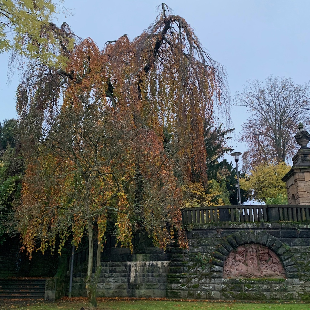 Dienstag: O tosendes Novemberbrausen: Auch dieser Tag begann überraschend mild, doch mit Regen, deshalb war wieder die Bahn das Verkehrsmittel der Wahl. Hinzu kam eine amtliche Sturmwarnung, deren Winde nicht nur den Gebrauch des Regenschirmes erschwerten, sondern auch den Turm umwehten und ihn wie ein altes Schiff knarzen ließen, was dem Arbeitstag bei aller Büronüchternheit eine gewisse Behaglichkeit verlieh. Abends regnete und blies es noch immer, zudem hat es sich spürbar abgekühlt, was den Fußweg zurück vereitelte. Den hatte ich ja bereits gestern. Dennoch mag ich den November.