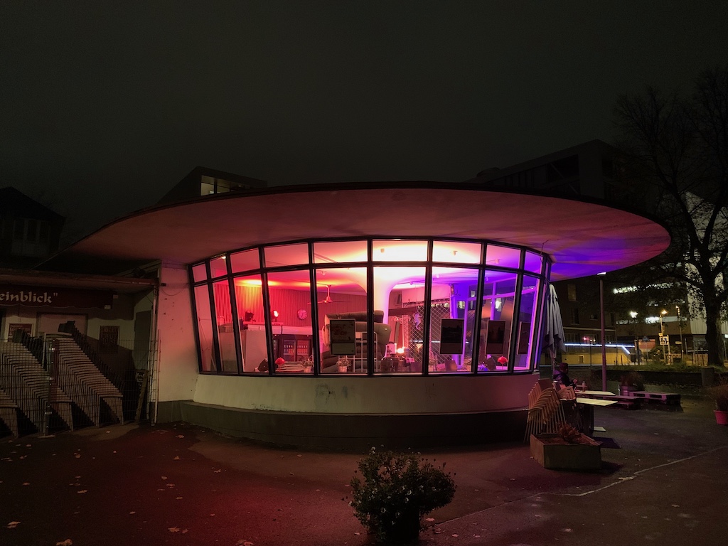 Auch dem Rückweg durch die Kälte, die sich kälter anfühlte als das Thermometer am UN-Campus anzeigte, wäre ich einem Glühgetränk am Rheinpavillon zugeneigt gewesen, leider ist die Bude noch nicht aufgebaut. Dennoch war die Terrasse von Lichterketten illuminiert, an der Außentheke stand eine Gruppe und trank aus Pappbechern. Augenscheinlich eine Gesellschaft, deshalb verwarf ich die Idee, mich dazu zu gesellen.