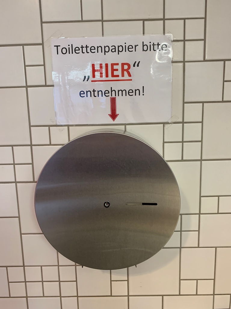 Zum einen über die keinerlei Sinn ergebenden Anführungszeichen. Vor allem aber über den Anbringungsort bei den Waschbecken und nicht in den Verrichtungszellen. Das verstehe ich nicht: Nach meiner Erfahrung hat es sich bewährt, unmittelbar nach dem Geschäft nach dem Papier greifen zu können, ohne die Gründe dafür weiter auszuführen. Wie läuft das hier? Entnimmt der Schüler vorher so viele Blätter, wie er zu benötigen schätzt? Wenn er zu großzügig geschätzt hat, wird er das überzählige Papier vermutlich mit wegspülen, was Verschwendung ist. Was aber soll er tun, wenn er zu wenig mit in die Kabine nahm?