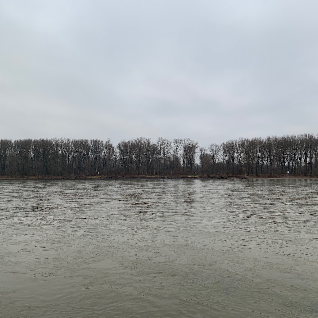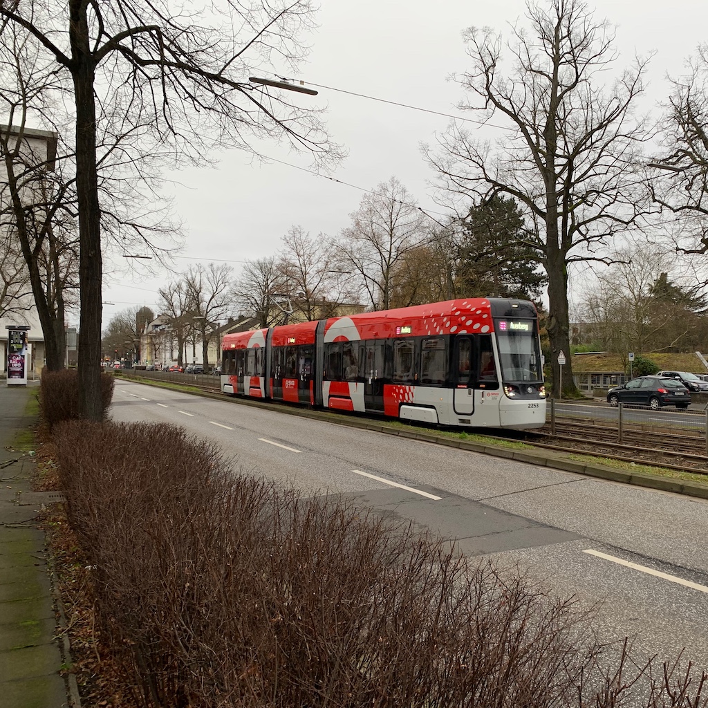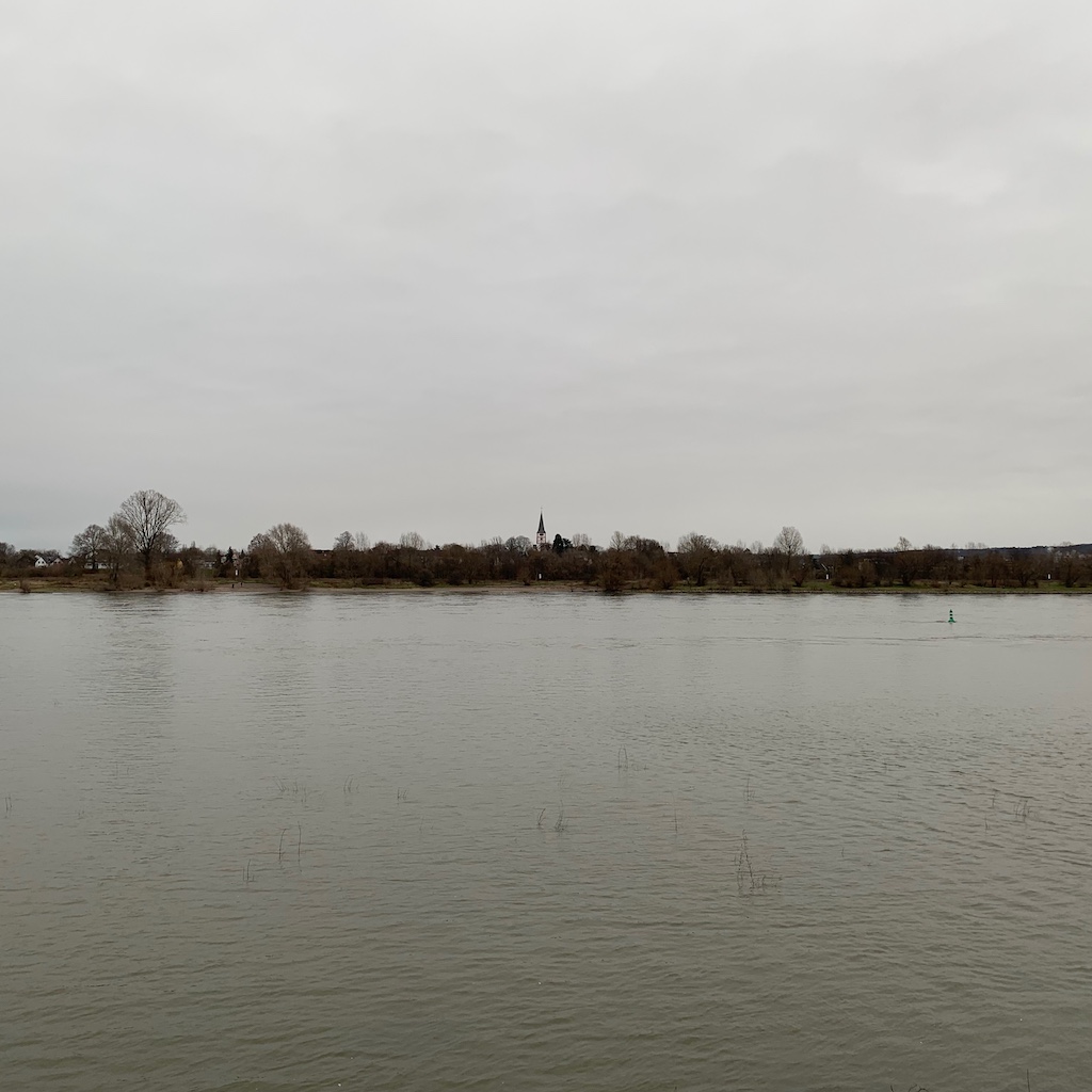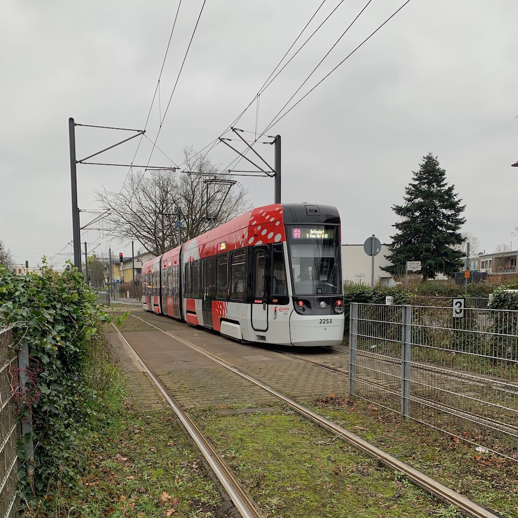 Sonntag: Im Gegensatz zu den Vortagen blieb dieser Tag trüb und kalt, die Pfützen auf den Wegen waren gefroren. Den letzten Sonntagsspaziergang des Jahres verband ich mit einer Probefahrt der neuen Straßenbahnwagen. Zum Glück kam auch gleich einer, im Moment fahren sie noch im Mischbetrieb mit den alten auf der Linie 61. Damit fuhr ich bis bis zur Endhaltestelle in Auerberg und flanierte am Rhein entlang zurück, ein gut einstündiger Marsch, den ich so noch nicht gegangen war. Die neuen Wagen laufen sehr ruhig, was dem an Straßenbahnzügen nicht so interessierten normalen Fahrgast vielleicht gar nicht auffällt.
