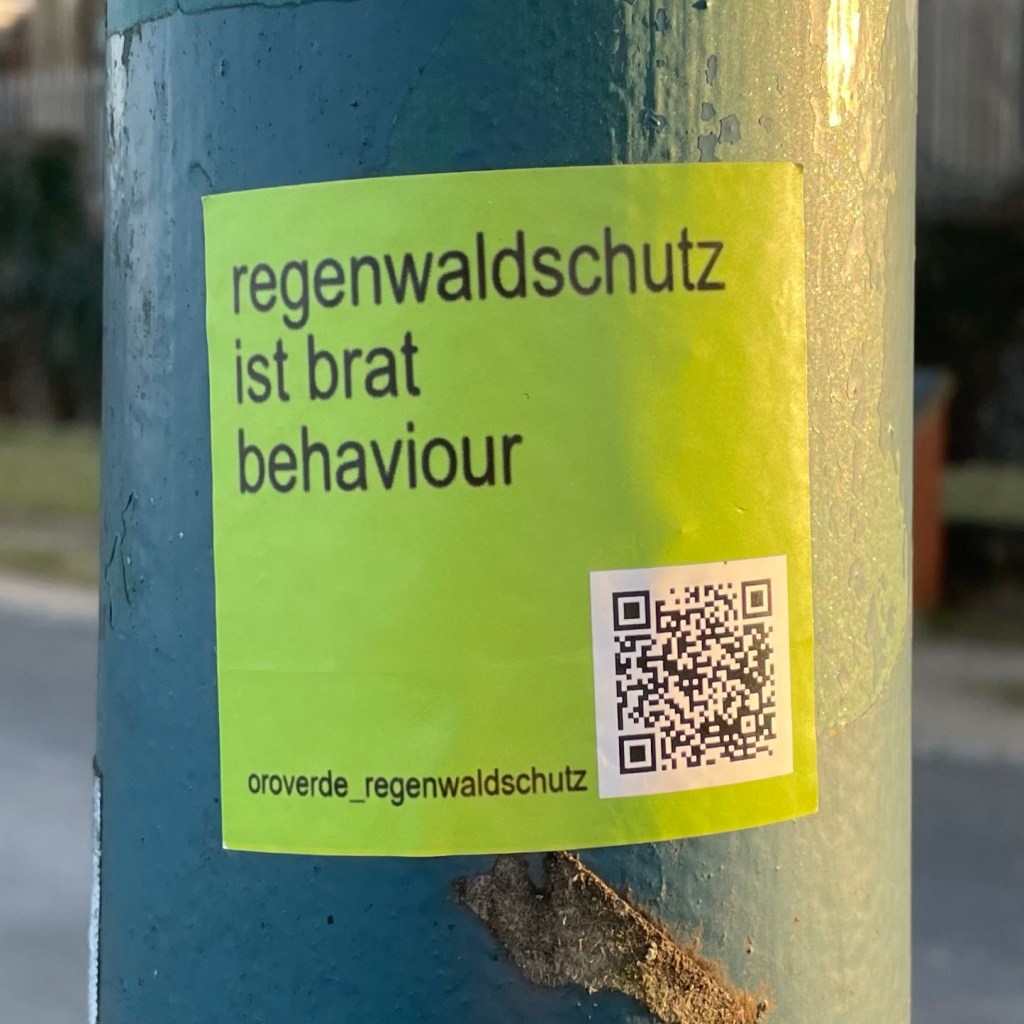 Wo es gerade um Bäume geht: Diesen eher rätselhaften Aufkleber fand ich an einem Lampenpfahl vor.