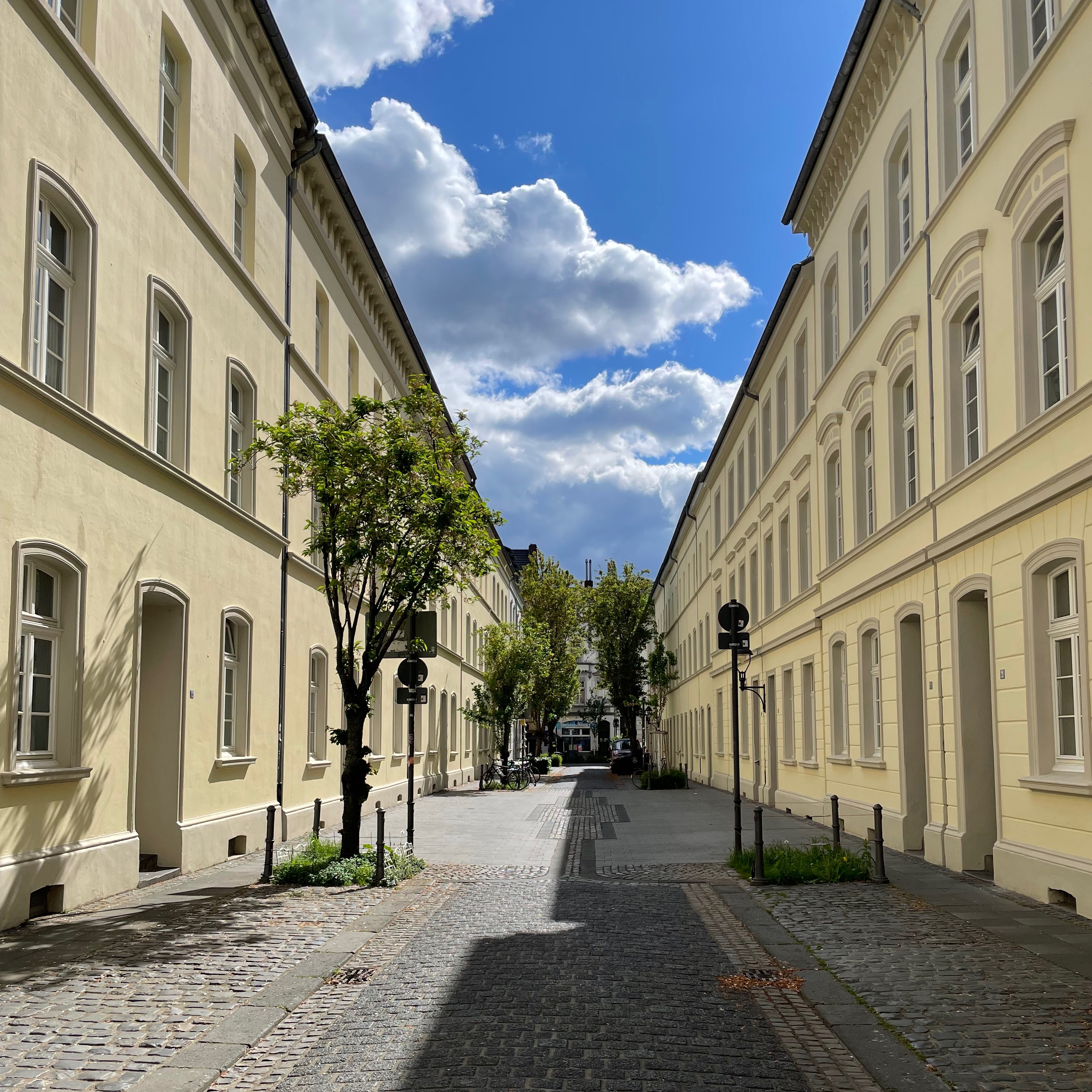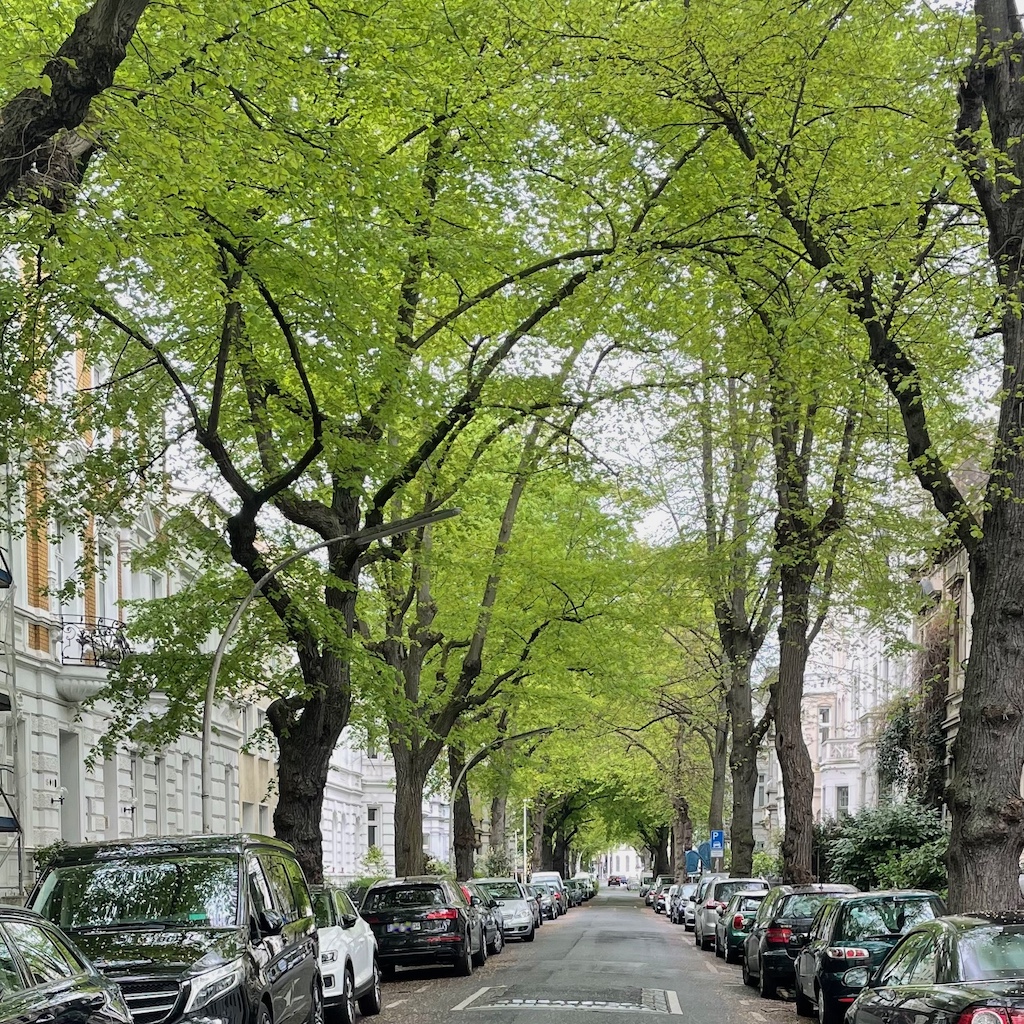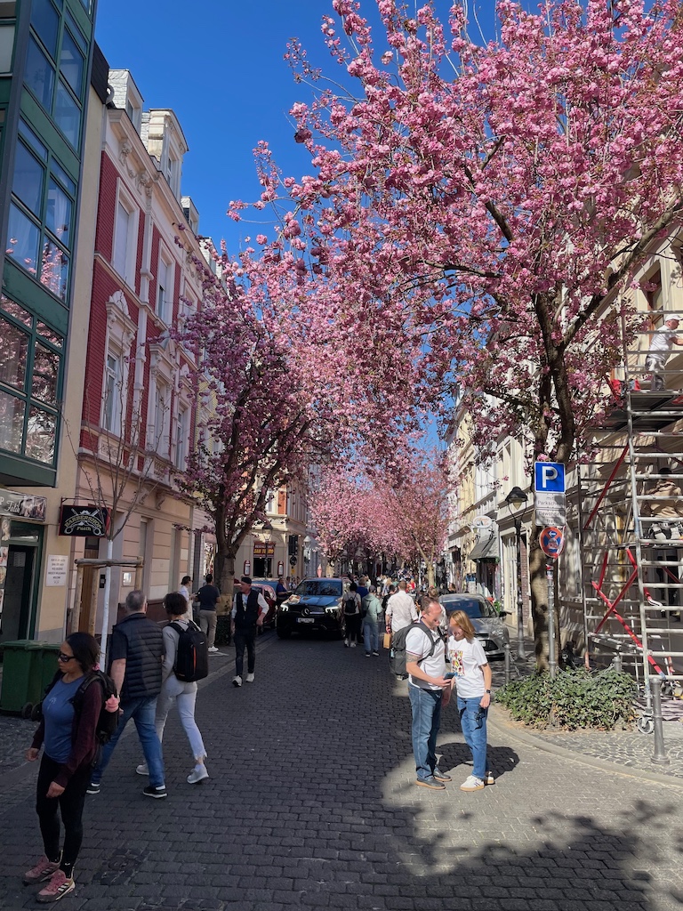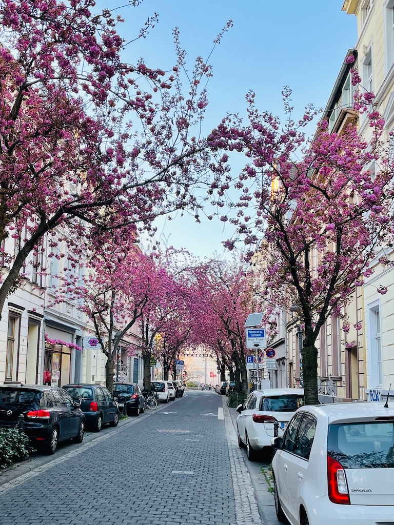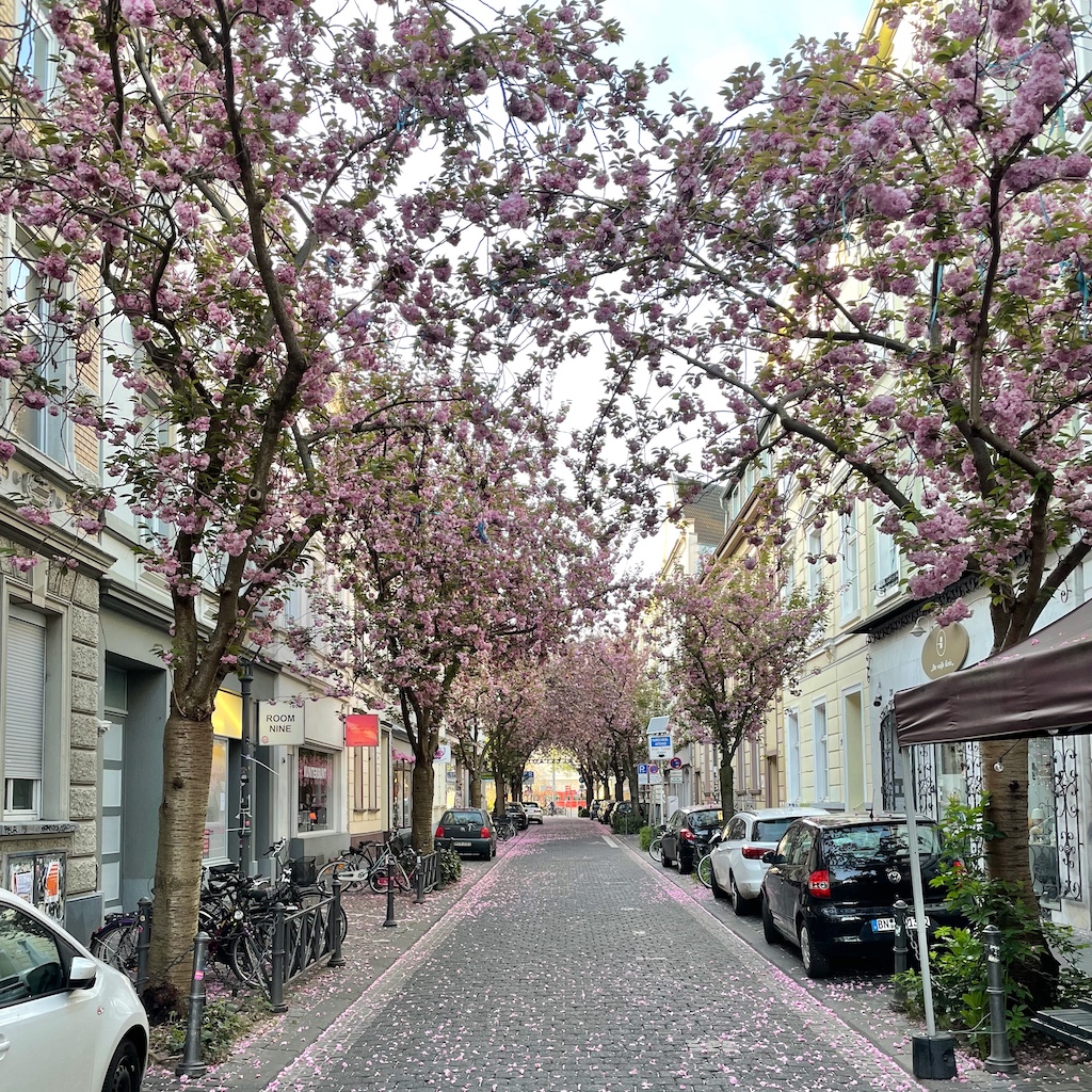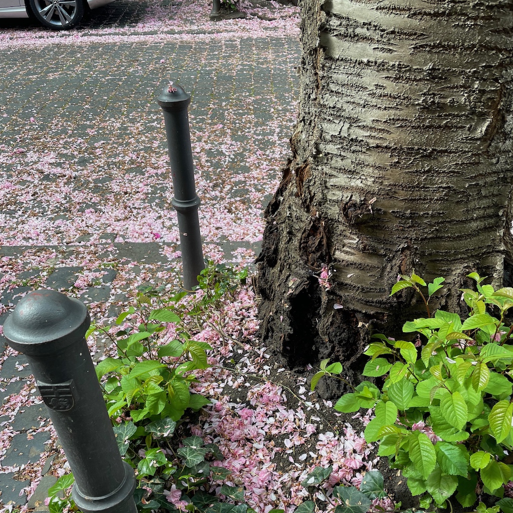 Die Zufahrten zur Inneren Nordstadt sind weiterhin für den Durchgangsverkehr gesperrt, obwohl die meisten Kirschblüten inzwischen abgefallen sind und einen rosa Niederschlag auf dem Pflaster bilden.