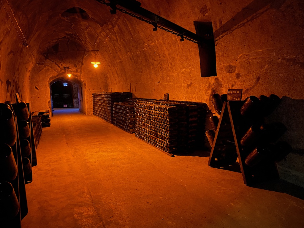 Anschließend besichtigten wir den Keller von Pommery. Über 136 Treppenstufen steigt man hinab und durchschreitet ziemlich dunkle Gänge, in denen neben unzähligen Champagnerflaschen in allen gängigen Größen zahlreiche Kunstwerke zu sehen sind, die mit der Schaumweinkellerei in keinem erkennbaren Zusammenhang stehen und aus meiner unmaßgeblichen Sicht dort entbehrlich sind. Immerhin bekommt man, nachdem man die 136 Stufen wieder aufgestiegen ist, ein Gläschen eingeschenkt. Insgesamt erschien es mir ziemlich teuer für das Gebotene, muss man nicht unbedingt machen. Zurück fuhren wir über die Dörfer, in denen bekannte große Champagner-Produzenten ihre Residenzen haben.