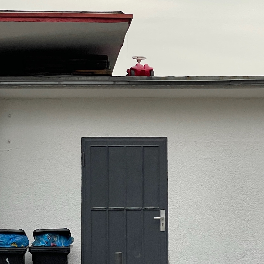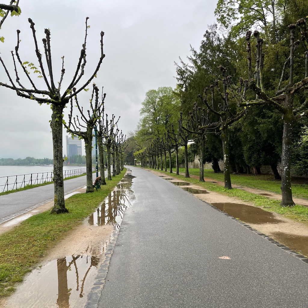 Auch heute regnete es die meiste Zeit, freundlicherweise morgens nicht und abends nur leicht, so dass ich zu Fuß trocken ins Werk und zurück kam. Zurück nur einigermaßen trocken, nicht weil wieder die Gastronomie lockte, vielmehr waren bei Rückkehr trotz Schirm die Socken an den Fußspitzen feucht, als hätte ich Sandalen statt Turnschuhe* getragen. Offenbar nicht die richtigen für Leichtregen. Auf dem Hinweg sah ich am Rheinufer den Monteurwagen eines Unternehmens mit dem Namen „Pipe Protection“, dessen Profession demnach in der Wartung von Leitungen liegt. Wäre es meine Firma, hieße sie vielleicht „Rohrsorge“.