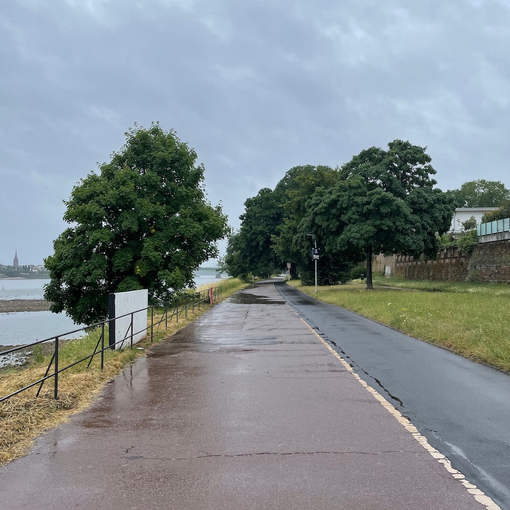 Sonntag: Nach strukturellem Biertrinken auf dem Godesberger Parkfest am Vortag, wo die Karnevalsgesellschaft mit Getränkeausschank und Grillstand vertreten war, blieben wir heute etwas länger liegen. Dabei verpassten wir nichts, es regnete den ganzen Tag und es hat sich deutlich auf unter zwanzig Grad abgekühlt. Das war kein Grund, auf den Spaziergang am Nachmittag zu verzichten, der mit einer Runde durch die Nordstadt und an den Rhein etwas kürzer ausfiel und gastronomisch unbegleitet blieb. Etwa auf halber Strecke bemerkte ich, dass es eine ganz gute Idee gewesen wäre, die wasserdichten Wanderschuhe anzuziehen, leider zu spät. Trotz riesigem Regenschirm, unter dem eine vierköpfige Familie Platz hätte, gelingt es mir nie, die Füße trocken zu halten. Nur wenige Menschen zog es bei dem Wetter nach draußen, die Rheinpromenade war nahezu menschen- und fahrradleer, das Tor zum Lieblingsbiergarten verschlossen. Bedauerlich war das Wetter für die Teilnehmer an der heutigen CSD-Parade in Köln, die dadurch die Wahl hatten zwischen Frieren und weniger Haut zu zeigen.