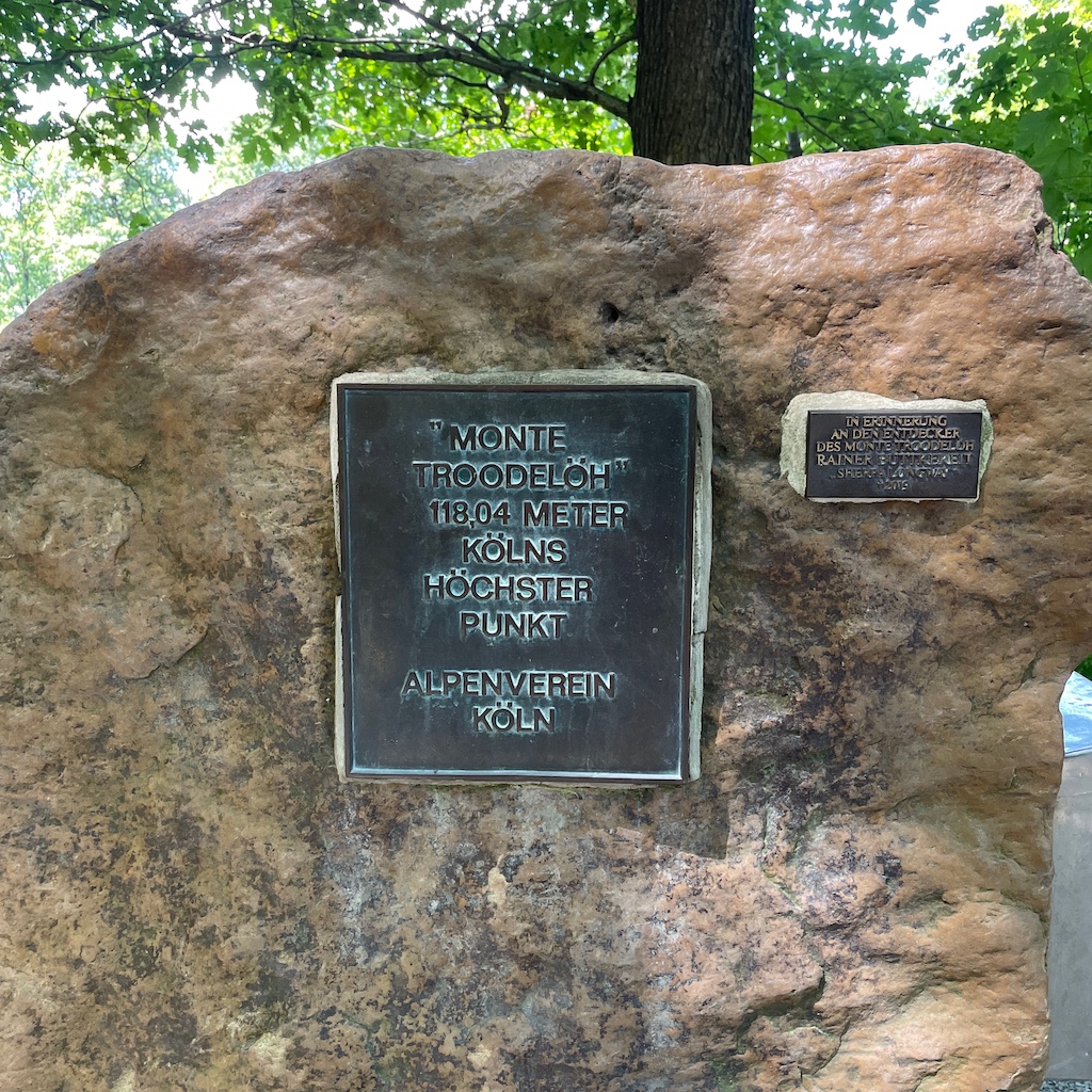 Die ersten Kilometer der Wanderung erschienen zunächst etwas eintönig mit geraden, breiten Wegen, doch dann wurde es deutlich abwechslungsreicher. Für warme Tage ist die Strecke ideal: überwiegend im Wald, keine nennenswerten Steigungen und Stolperstellen, und mit achtzehn Kilometern nicht zu lang. Höhepunkt der Tour, jedenfalls geografisch, ist der Monte Troodelöh, laut Beschilderung der höchste Punkt Kölns. Es gibt sogar ein Gipfelbuch, in das ich mich selbstverständlich eintrug. Im Gegensatz zur Zugspitze, wo wegen des hohen Andrangs kürzlich ein zweites Gipfelkreuz aufgestellt wurde, wie dieser Tage zu lesen ist, war hier nichts los.