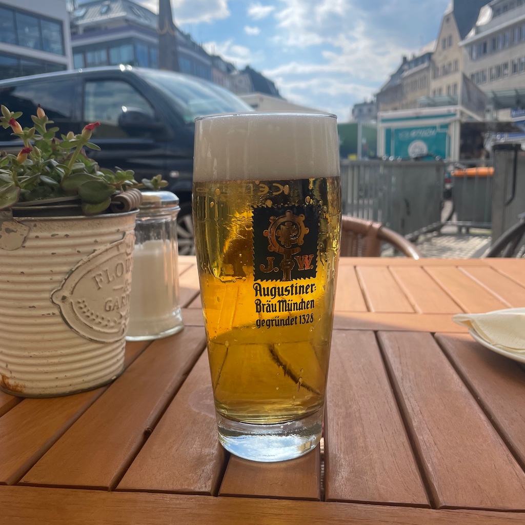 Ich fühle mich verstanden und inspiriert, daher verband ich einen Einkaufsauftrag am frühen, wieder sonnigen Abend sogleich mit dem Besuch einer Gaststätte in der Altstadt, wo draußen zufällig ein Tisch frei war. Ich trank nur eins und war sehr zufrieden.