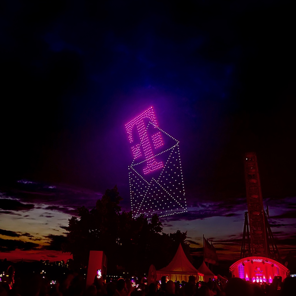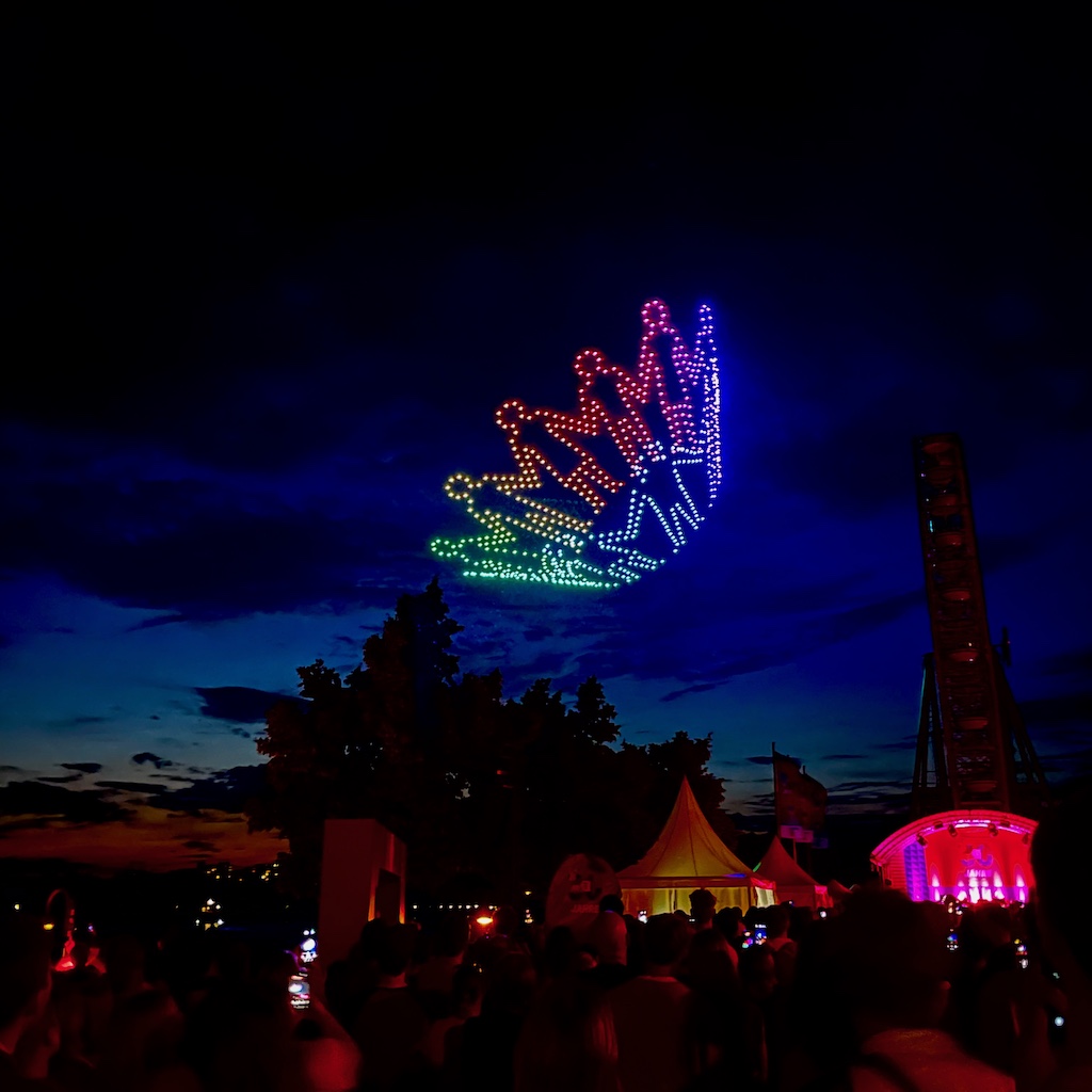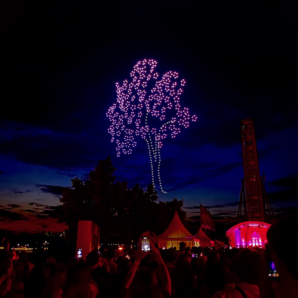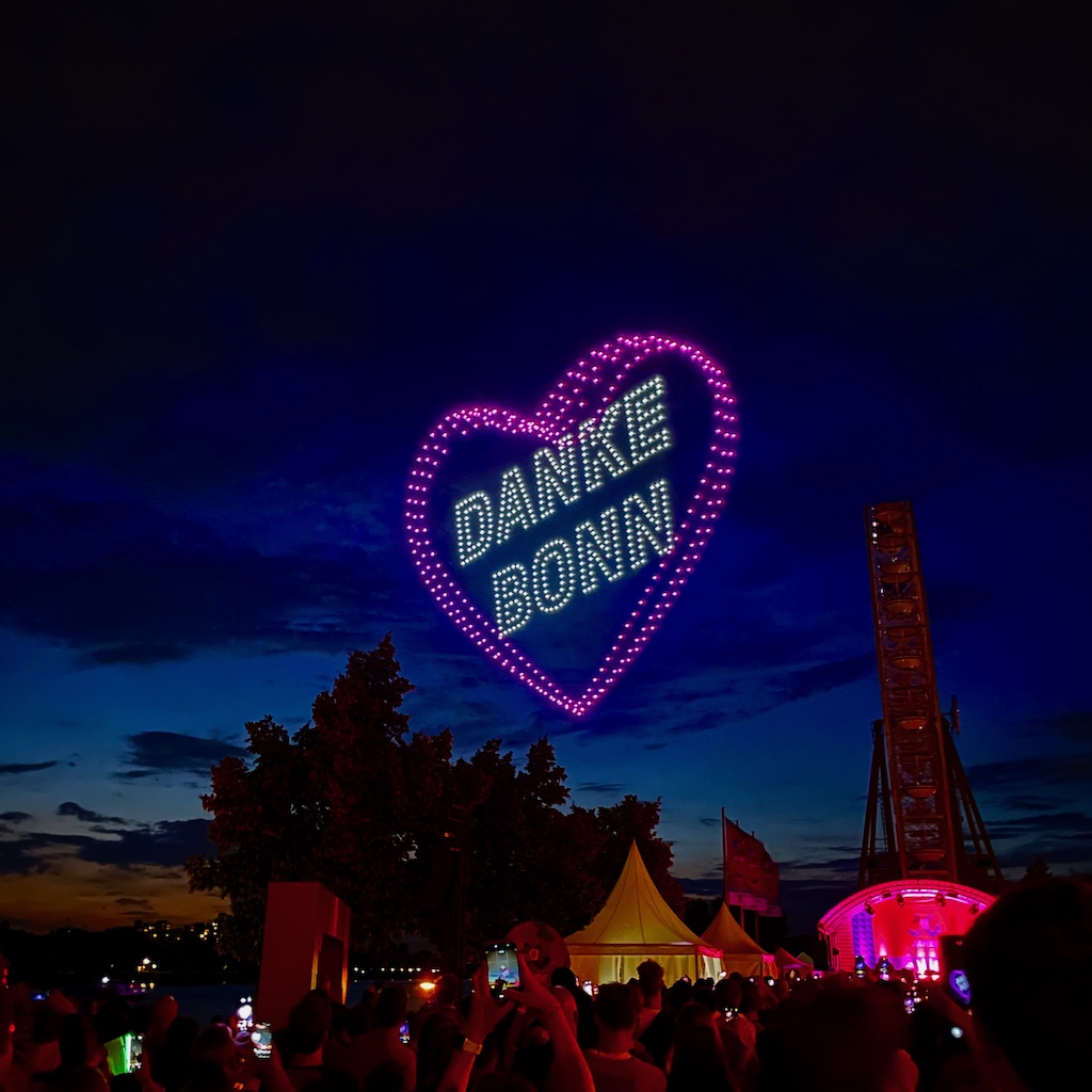 Abends gingen meine Lieben und ich rüber ans andere Rheinufer, um uns zusammen mit einigen tausend Anderen die Drohnenshow anzuschauen, die die Telekom zu ihrem Jubiläum bot. Zunächst war ich skeptisch, weil ich große Menschenansammlungen nicht mag, doch es war sehr entspannt und ungedrängt. Es hat sich gelohnt, ich fand es äußerst faszinierend, wie viel Freude siebenhundert Drohnen verbreiten können, wenn sie friedlich eingesetzt werden. Auch wenn der Stromverbrauch der dahinter stehenden Rechenleistung womöglich dem Tagesbedarf einer mittleren Kleinstadt entspricht.