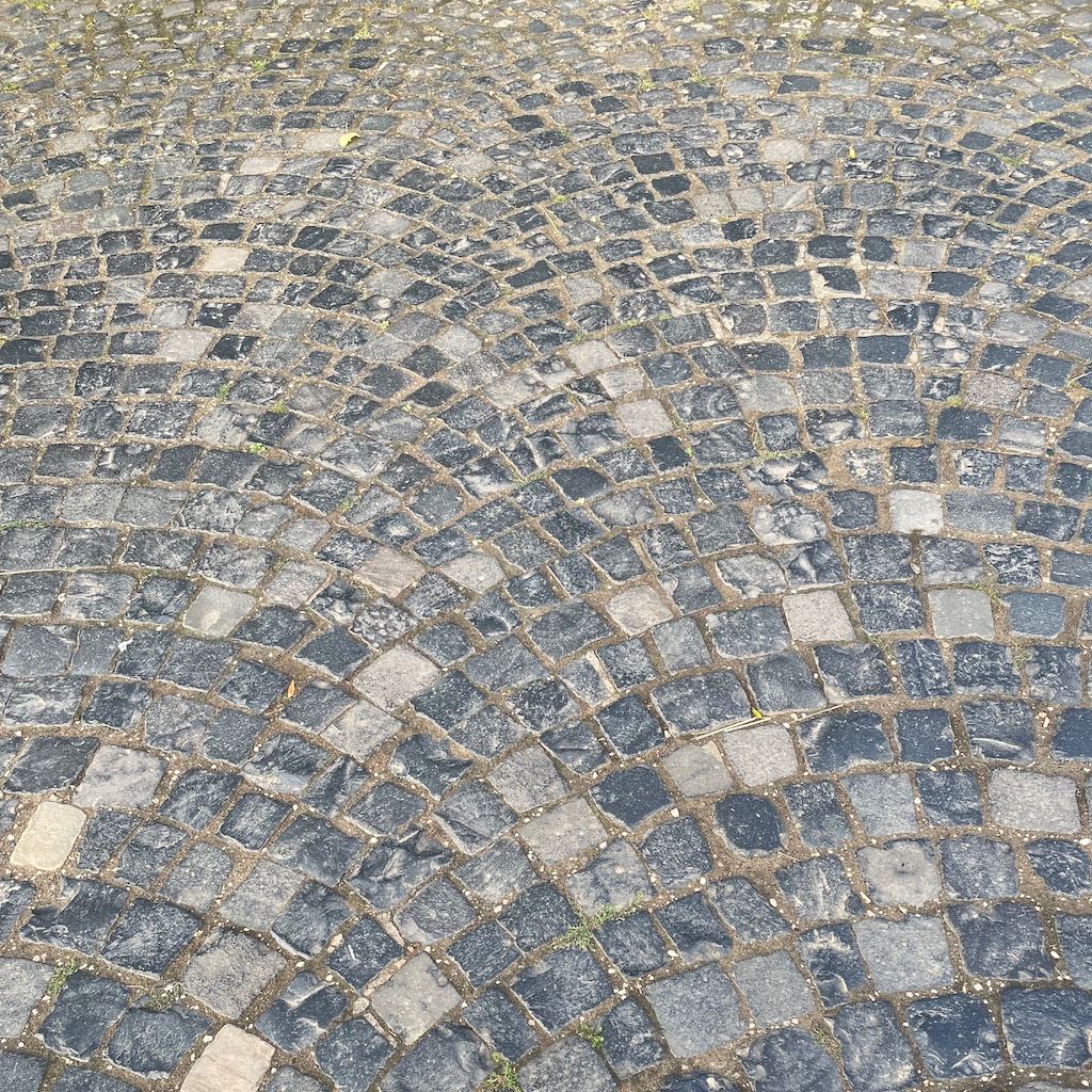 Während des Fußwegs ins Werk dachte ich über Kunst nach, man hat ja sonst nichts zu bedenken. Gewiss ist es Kunst, besonders gut malen, dichten oder singen zu können, manche können davon leben, auch wenn man sich bei einigen (ich nenne keine Namen) fragt, wie das sein kann. Doch liegt wahre Kunst nicht im Alltäglichen? (Nein, dieses Blog ist nicht gemeint, auch wenn es so heißt.) Auf diesen Gedanken kam ich bei Betrachtung des gepflasterten Weges. Wieviel handwerkliches Können, wovon sich das Wort Kunst einem geflügelten Wort zufolge ableitet, liegt doch darin, die Steine derart in gleichförmigen, harmonisch ineinandergreifenden Bögen zu verlegen. Wer mag sich dieses traditionelle Muster dereinst ausgedacht haben, und ist es nicht wunderbar, es auch heute noch vielfach in Anwendung zu sehen? Dagegen ist so manche Skulptur eher abgewandte Kunst.