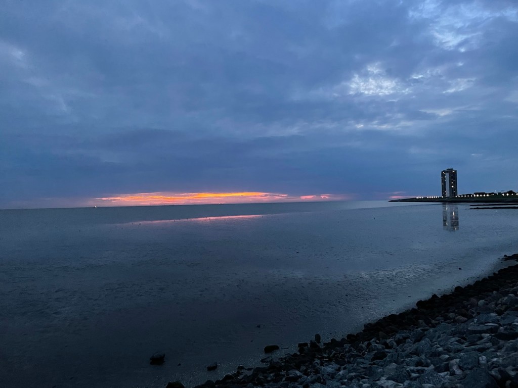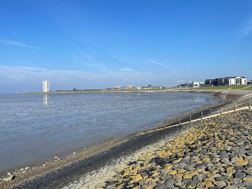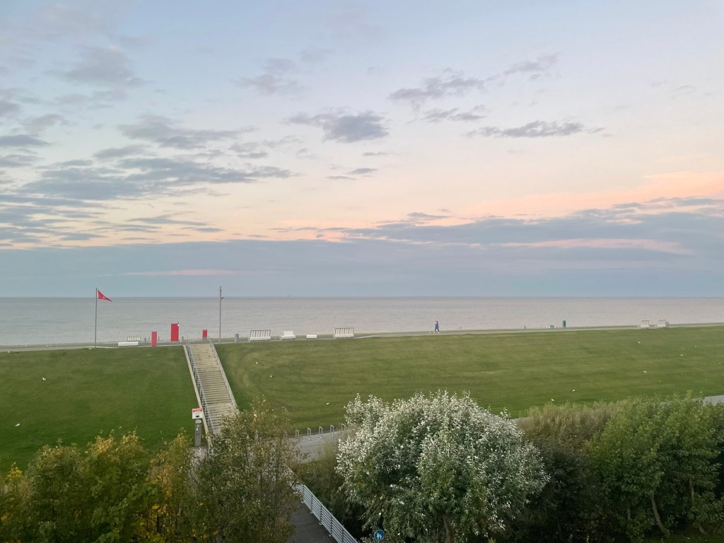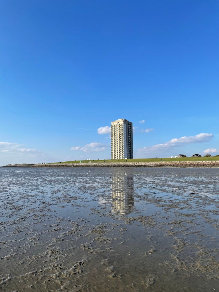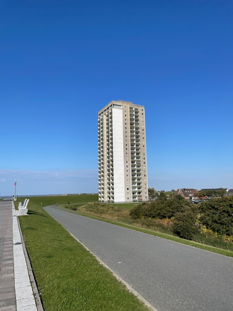 Stattdessen entschied ich mich für einen planlosen Schreib- und Drömmeltag mit lange im Bett bleiben und ausgiebigem Frühstück. („Ausgiebig“ ist auch so ein seltsames Wort. Man gibt ja nichts aus, im Gegenteil, man nimmt ein. Egal.) Nach dem Frühstück ging ich gemütlich auf dem Deich bis zur Hafenmole, dann am Strand entlang in die andere Richtung bis zur Perlebucht, ein künstlich angelegter Sandstrand unterhalb des Hochhauses. Überhaupt ging ich wieder sehr viel in den zurückliegenden Tagen. Auf der Liste der Fertigkeiten, deren Ausfall meine Lebensqualität am stärksten beeinträchtigen würde, steht Gehen sehr weit oben, gleich nach Sehen.