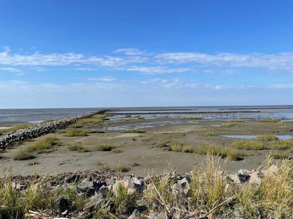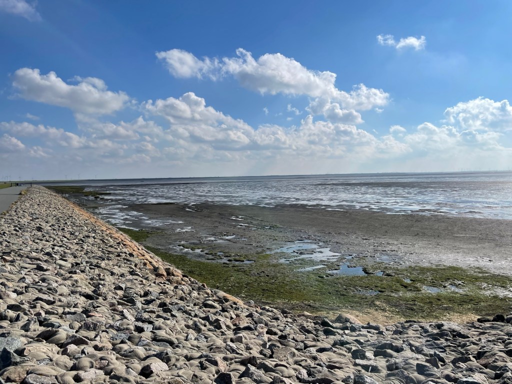 Nachdem ich genug geschrieben hatte, unter anderem dieses, trat ich den Rückweg an, und zwar, weil es gestern so schön gewesen war, nochmals barfuß durch das Watt. Beim Queren eines Priels und Durchschreiten der Wasserlinie wunderte ich mich erneut, wie warm mir das Wasser vorkam.