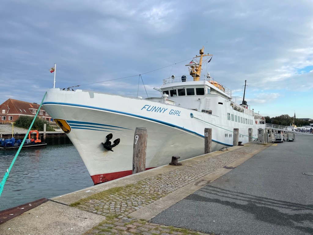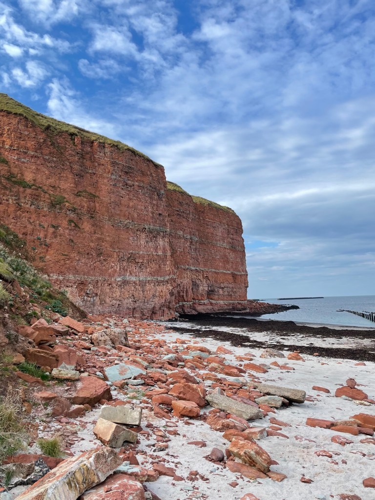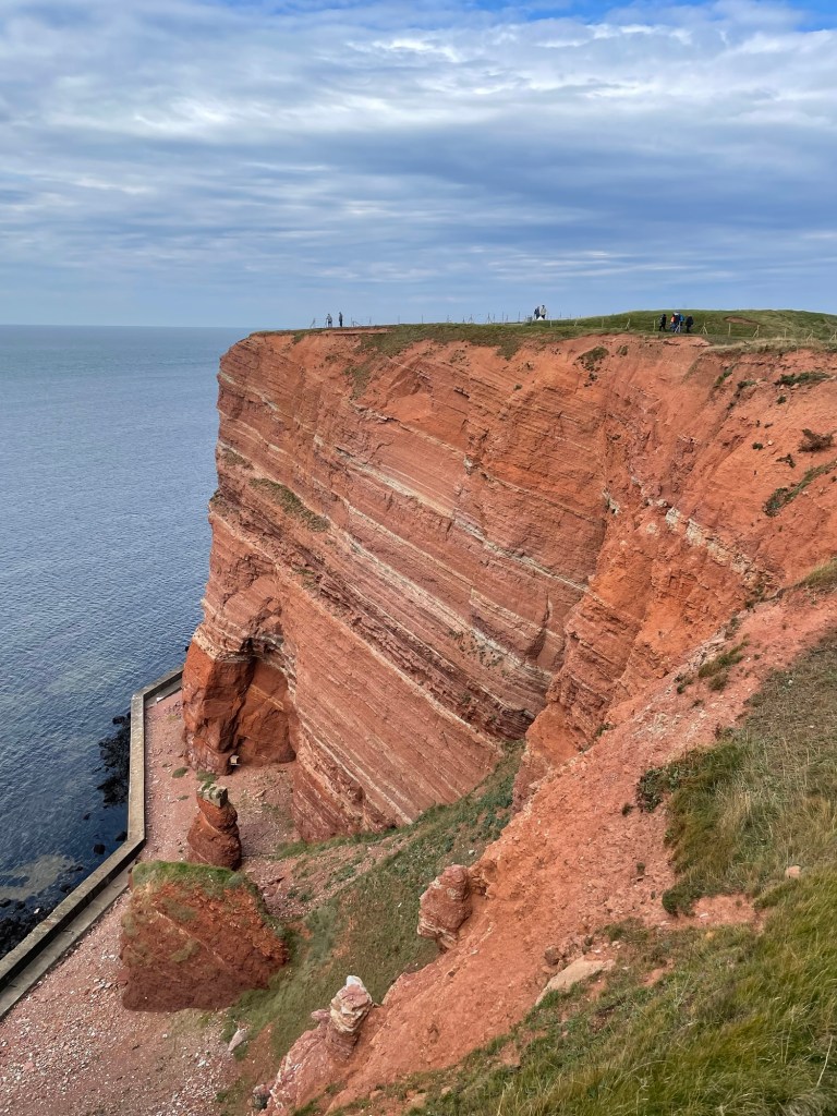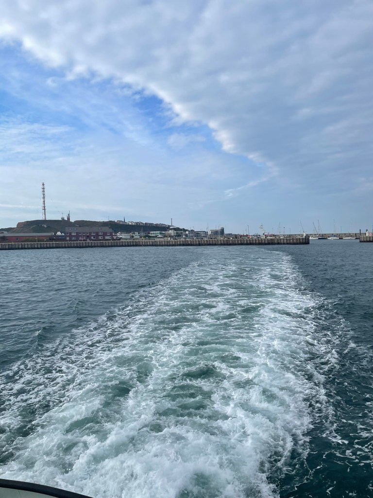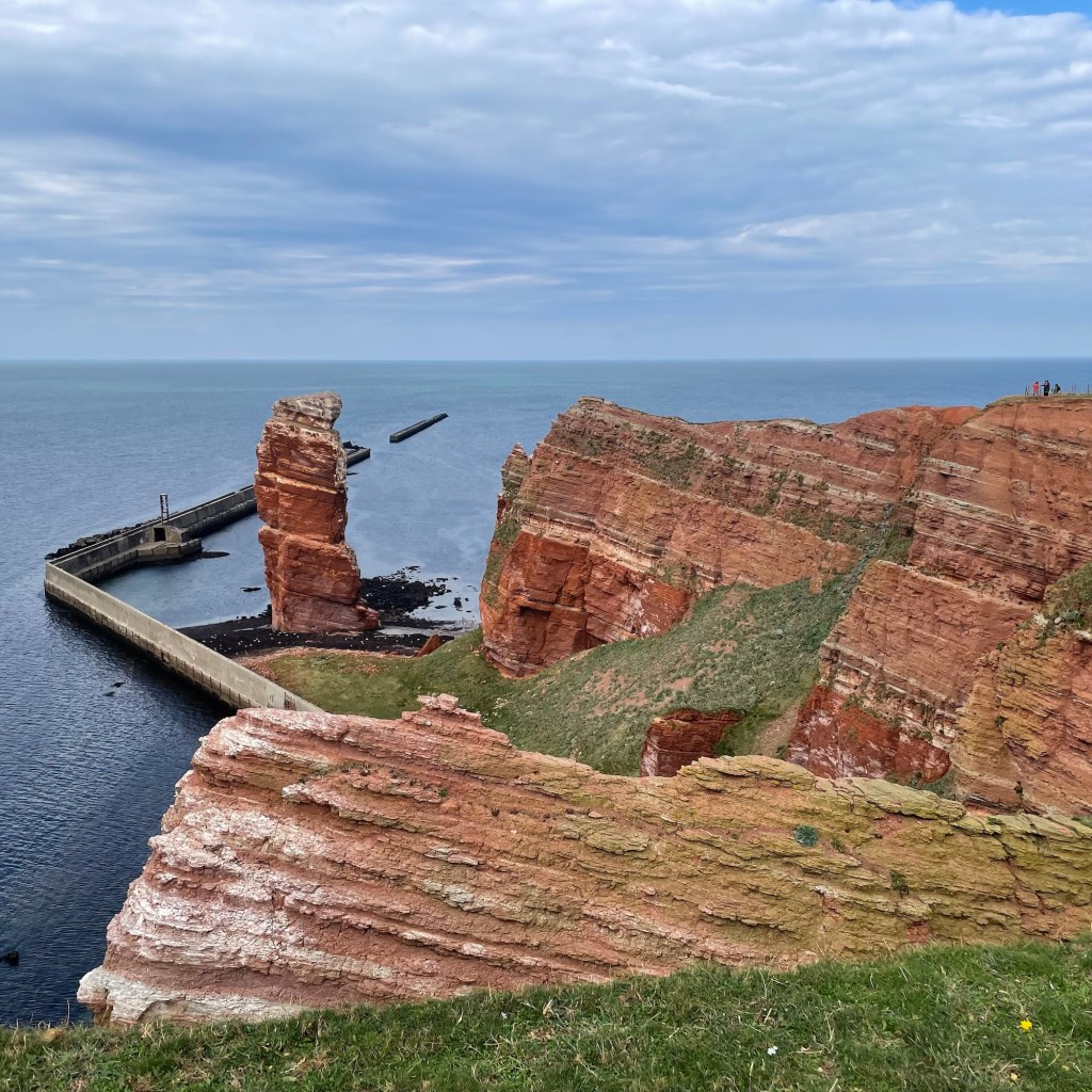 Nach zweieinhalb Stunden Fahrt erreichten wir Helgoland. Das letzte Mal war ich dort vor über vierzig Jahren. Damals mussten die Schiffe noch vor dem Hafen festmachen, die Fahrgäste wurden ausgebootet. Dazu mussten sie umsteigen in kleine schaukelnde Motorboote, die sie an Land brachten und zur Rückfahrt wieder zurück zum Schiff. Das ging so bis zur Corona-Zeit, wie ich heute erfuhr. Dann konnten in den Booten die Abstandsregeln nicht eingehalten werden, plötzlich konnten die Schiffe am Kai anlegen und ganz normal über eine Gangway verlassen werden. Die Bootsbetreiber mussten sich was anderes einfallen lassen, um die Touristen auszubooten.