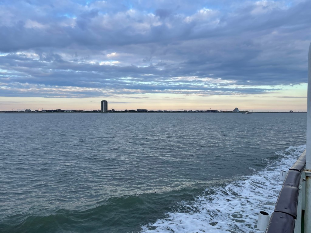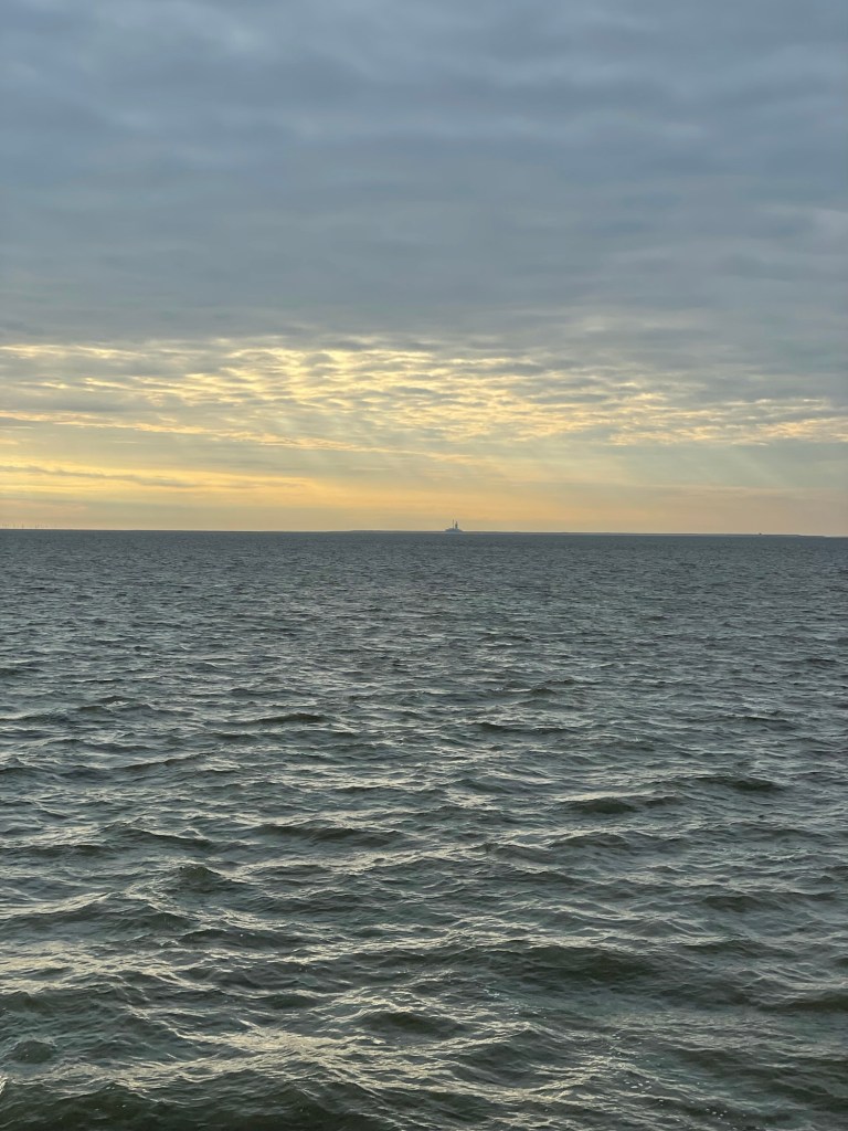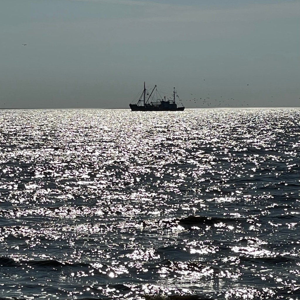 Nach zwei Stunden Treibenlassens verspürte ich jähen Heißhunger auf ein Fischbrötchen, die dort an mehreren Verkaufsstellen angeboten werden. Nachdem das Brötchen verzehrt war, blieb noch eine gute Stunde Zeit bis zur Rückfahrt. Diese verbrachte ich überwiegend untätig sitzend, während am Horizont große Frachtschiffe unseren Konsum und Wohlstand durch die Gegend fuhren, was überhaupt nicht langweilig war. Das nennt man wohl inzwischen Rawdogging, wie ich neulich las; ich beherrsche es gut.