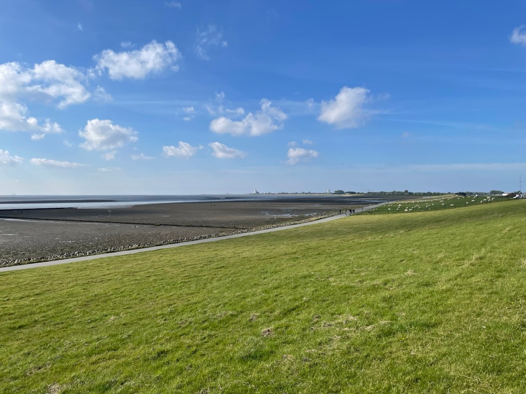 Eines der Dinge, die ich mir für diesen Urlaub vorgenommen hatte, war eine Wattwanderung, oder wenigstens ein Wattspaziergang, wie es sich gehört barfuß. Das erledigte ich direkt im Anschluss. Die Flut hatte schon wieder begonnen, doch es stand noch genug frei begehbare Fläche zur Verfügung. So ging ich bis zur Wasserlinie und war überrascht, wie warm die Nordsee noch ist. Nachdem ich wieder an Land war und die Füße an einer der Fußbrausen gereinigt hatte – vorsorglich hatte ich morgens ein Handtuch eingepackt – ging ich in die Stadt und kaufte Postkarten, die ich umgehend bei einem Nachmittagsgetränk in einer Gaststätte beschriftete und noch am Abend in den Briefkasten einwarf. Dass ich voraussichtlich früher in Bonn zurück bin als die Karten bei den Empfängern nehme ich in Kauf, sie freuen sich hoffentlich trotzdem darüber.
