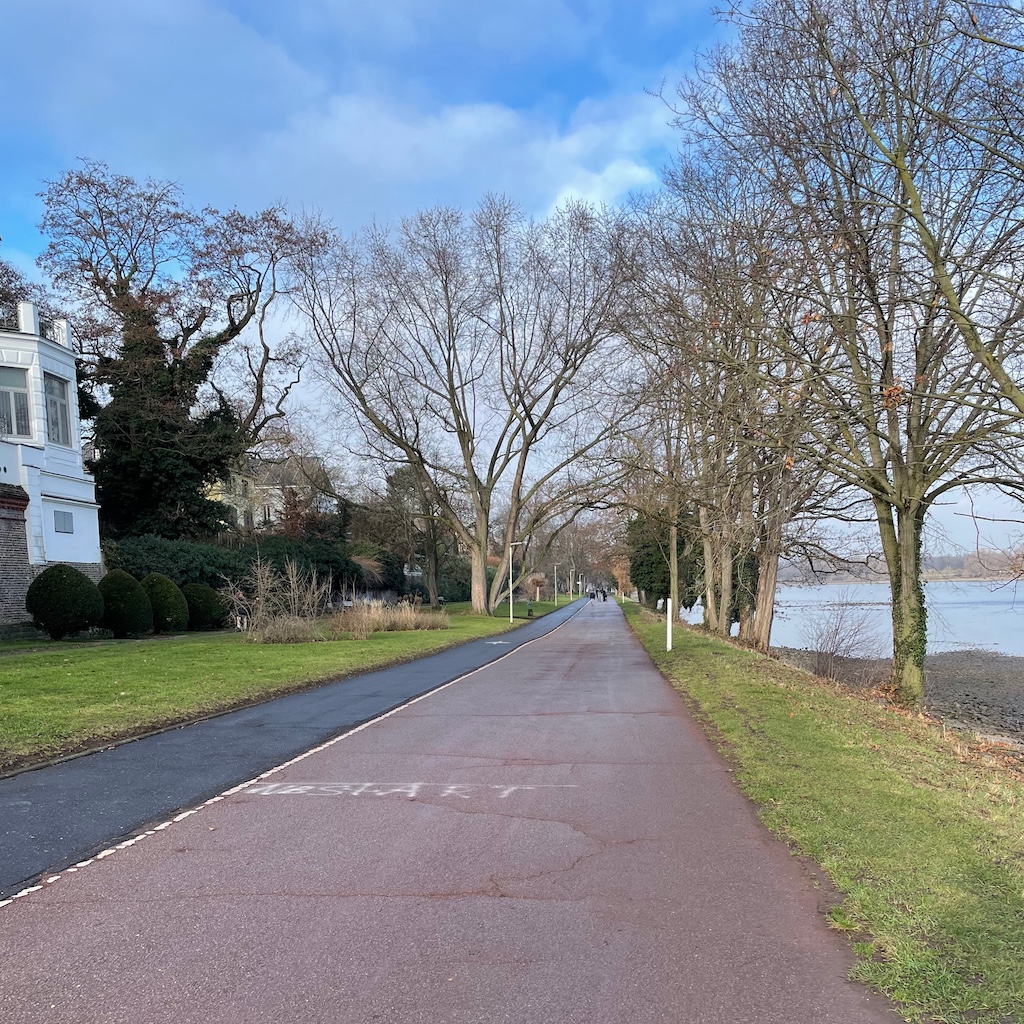 Mittwoch: … er wirkt gegebenenfalls etwas nach. Das Frühstück, an diesem arbeitsfreien Silvestertag aushäusig, schmeckte jedoch wieder, einschließlich dem dazu gereichten Morning Mimosa, ein Prosecco-Saft-Gemisch. Während meine Lieben anschließend noch ein paar Einkäufe tätigten, unternahm ich einen Spaziergang an den Rhein, wo ich mir ein Vorher-Bild machte, ehe die Uferpromenade ab Mitternacht wieder zugemüllt sein wird mit den saisonalen Pyroabfällen.