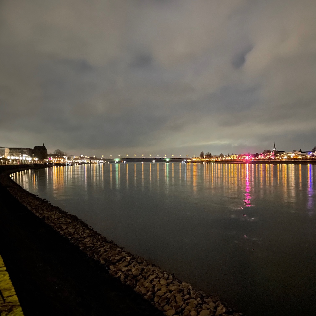 Wie im Vorjahr verbrachten wir den Silvesterabend entspannt im Restaurant an der Adenauerallee. Deutlich vor Mitternacht waren wir mit dem Essen durch und wir gingen zu Fuß am Rhein entlang nach Hause, während hier und da die ersten Raketen gezündet wurden. Ja näher wir der Innenstadt kamen, desto mehr Knallköppe Leute kamen uns entgegen auf dem Weg zum Rheinufer, viele bepackt mit Knallware. Zum Jahreswechsel stießen wir mit Champagner auf dem Balkon an, während es rundherum knallte und leuchtete. Haben wir das auch hinter uns.
