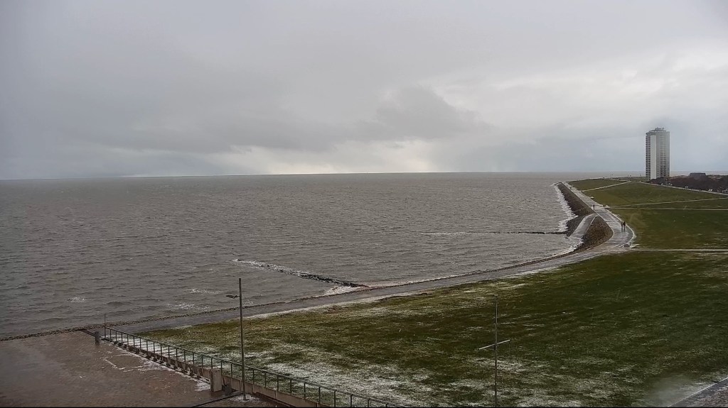 Schneefall mit Fleckenbildung auch an der Nordsee in Büsum, wie die örtliche Netzkamera zeigt: