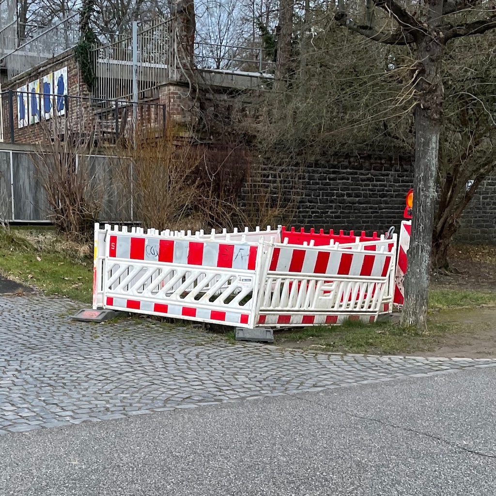 Auf dem Rückweg nahm ich am Rheinufer eine weitere, von rot-weißen Sperrbaken (oder wie die Dinger heißen, siehe unten) umrahmte Kleinbaustelle wahr. Ich weiß nicht, ob sie wirklich neu ist oder ob ich sie einfach bislang nicht wahrgenommen hatte, jedenfalls habe ich den Eindruck, die Baustellen, große wie kleine, werden ständig mehr, nie wird eine fertig. Auch das wird langsam etwas unheimlich, wobei es mir fernliegt, daraus eine Verschwörung oder ähnlich finstere Pläne abzuleiten.