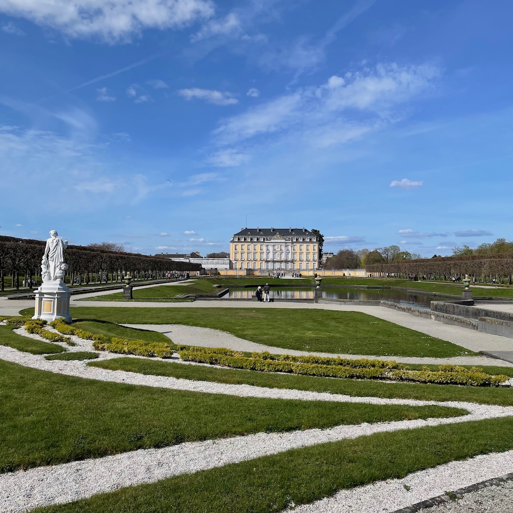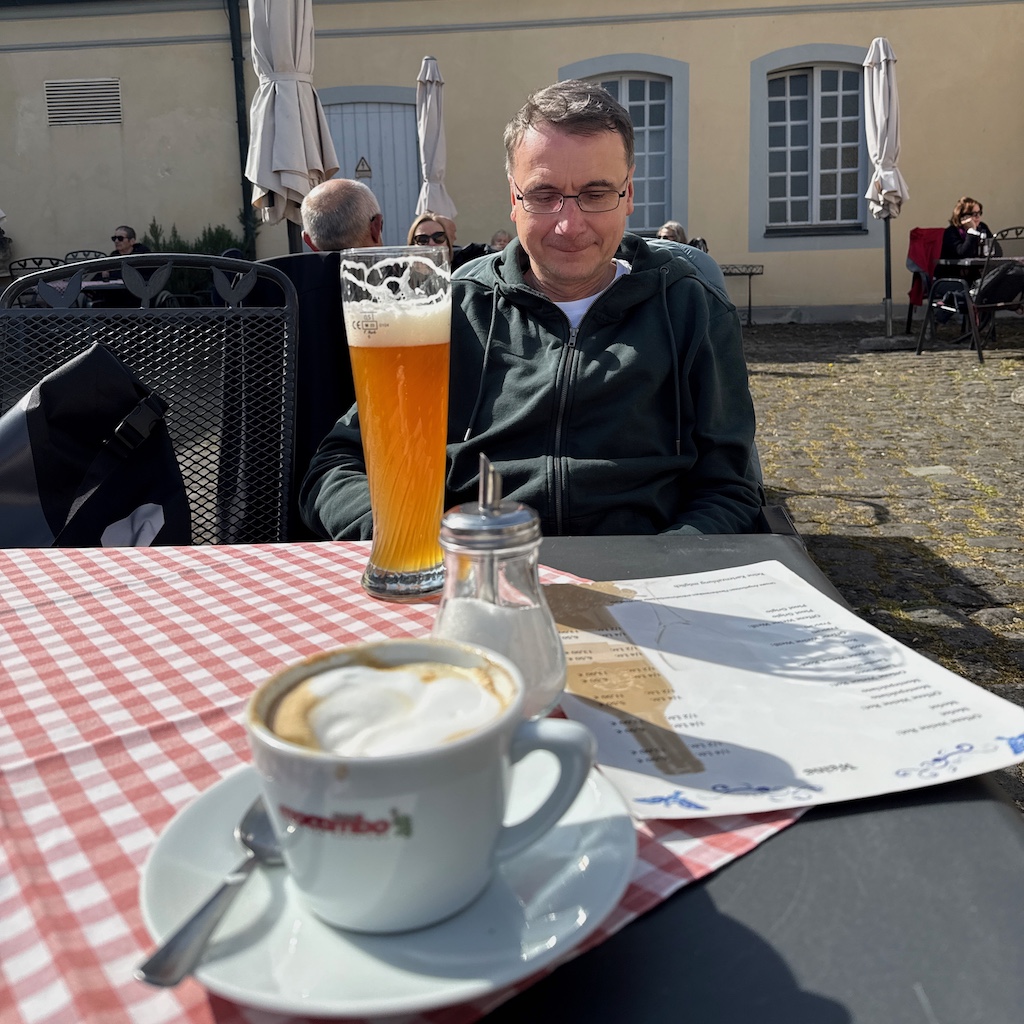 Ziel unserer Tour waren die Brühler Schlösser Augustusburg und Falkenlust. Ersteres besuchte und besichtigte ich letztmals vor schätzungsweise fünfundzwanzig Jahren, zweiteres noch nie. Wie das so ist, wenn man so etwas gleichsam vor der Haustür hat. In der Außengastronomie bei Schloss Falkenlust stärkten wird uns: ich mit Weißbier, der Liebste mit einem Cappuccino. Er war schon immer der Vernünftigere von uns.